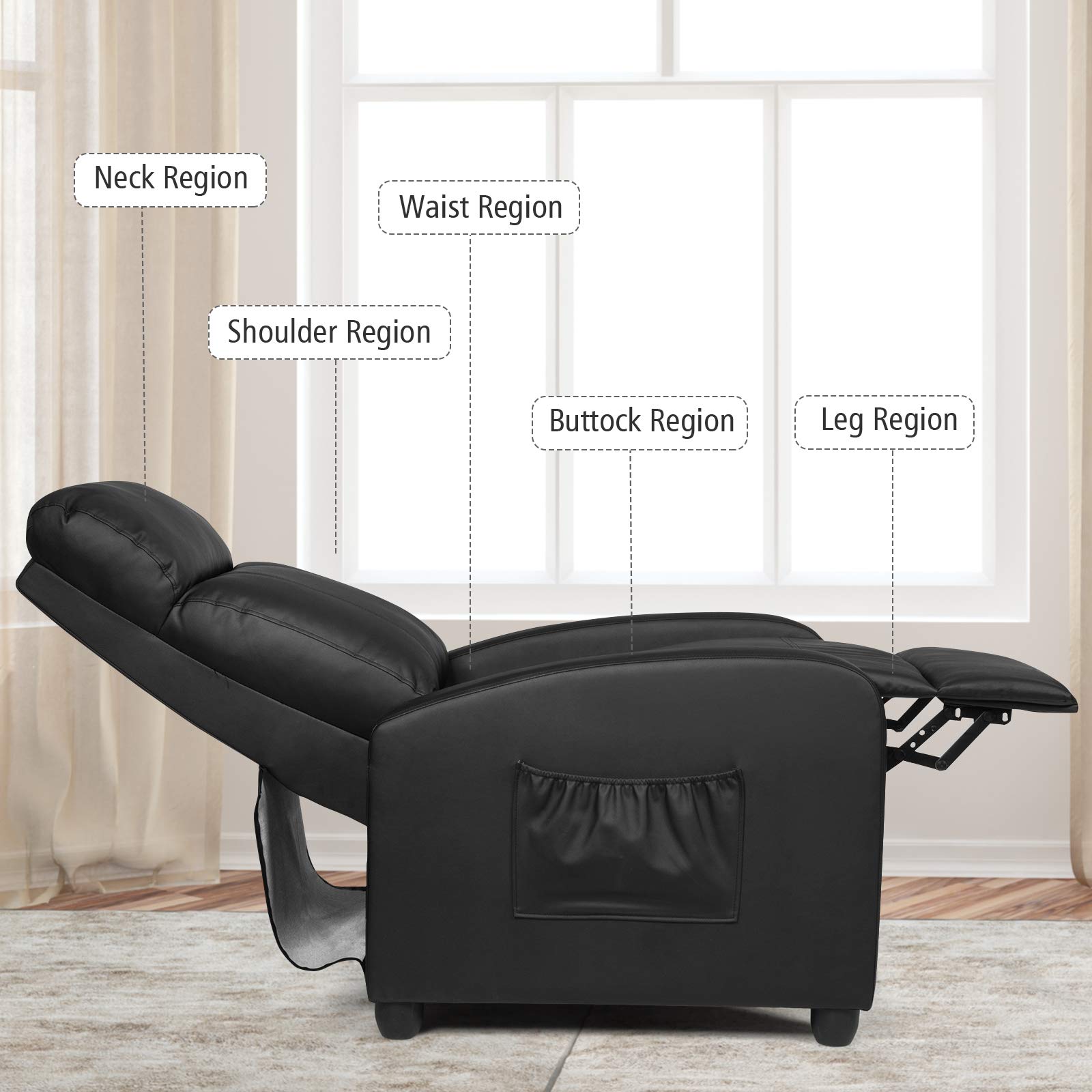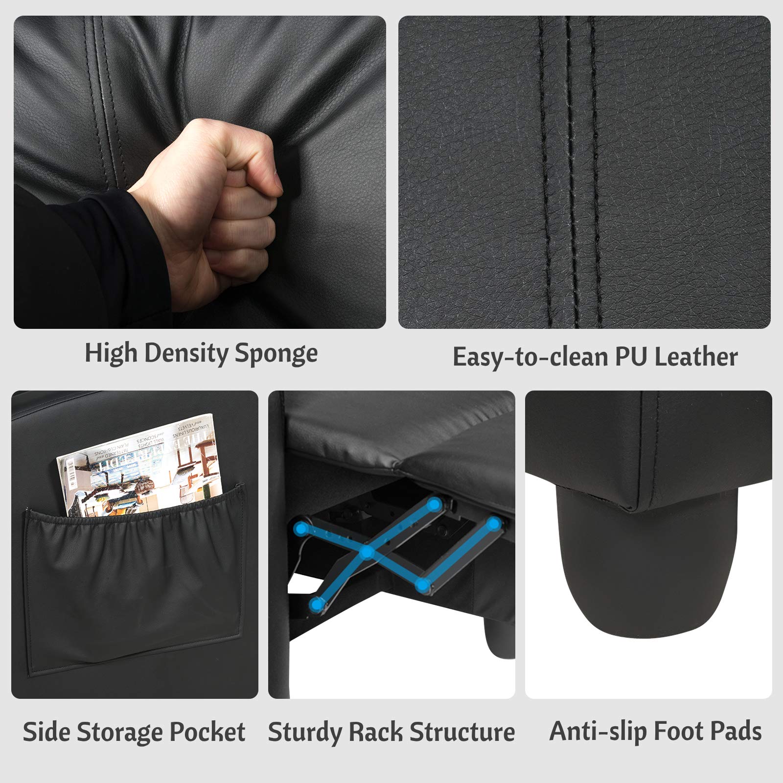 Maximum Comfort: This single reclining sofa is constructed of PU leather with high density sponge and soft cushion with elastic springs which provides maximum comfort. The cozy armrests, wide backrest and ergonomic footrest fit the body curve to give you full relaxation.