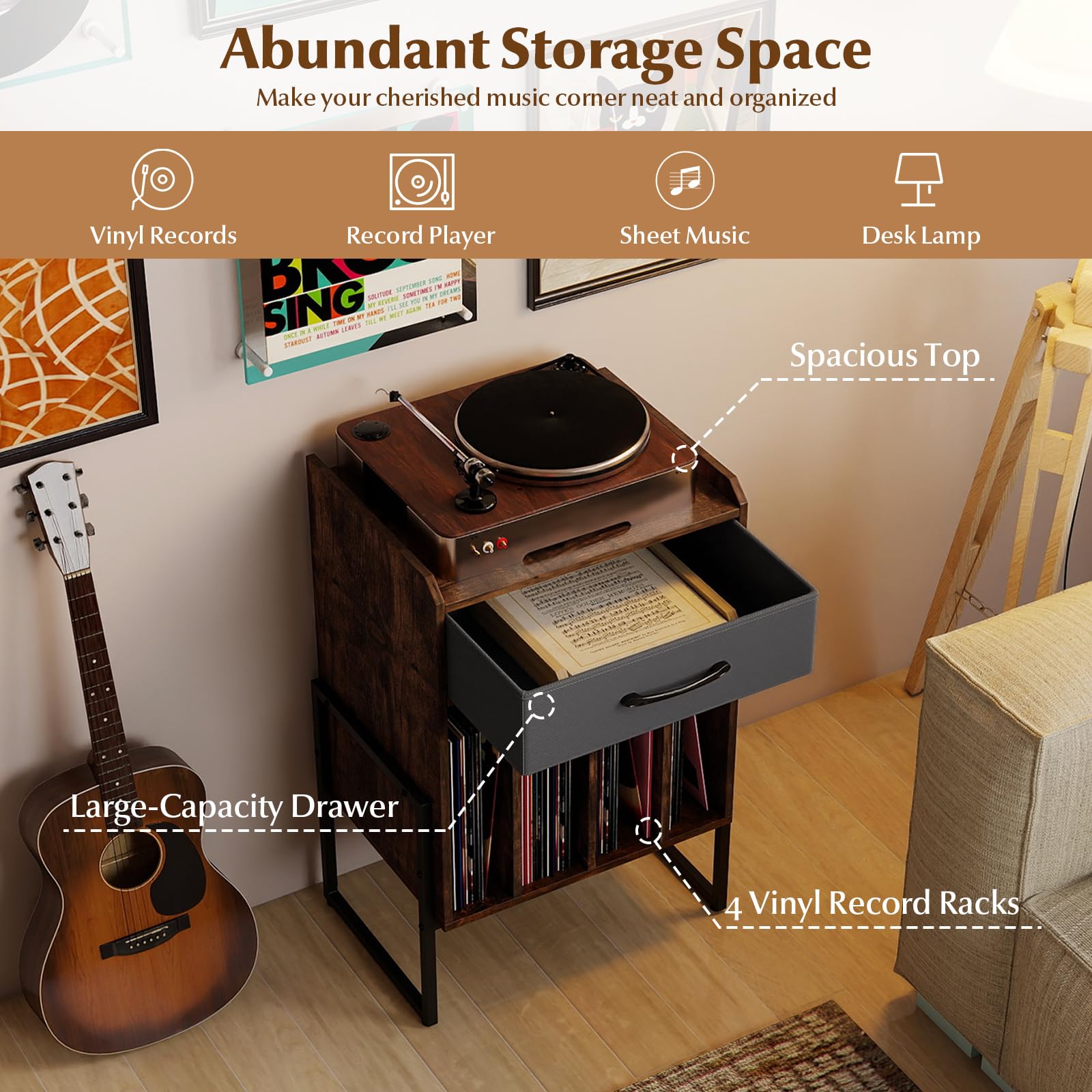 With a spacious top and a convenient drawer, the industrial turntable stand offers ample storage for your vinyl accessories. 4 open compartments provide abundant storage space for albums, making it easy to keep your collection neat and accessible. This record player stand features a sturdy metal frame that ensures durability and long-lasting support. Additionally, the included anti-toppling device adds an extra layer of safety by securely anchoring the stand to the wall. Perfect as a centerpiece in your living room, music room, or any space where your love for music shines.