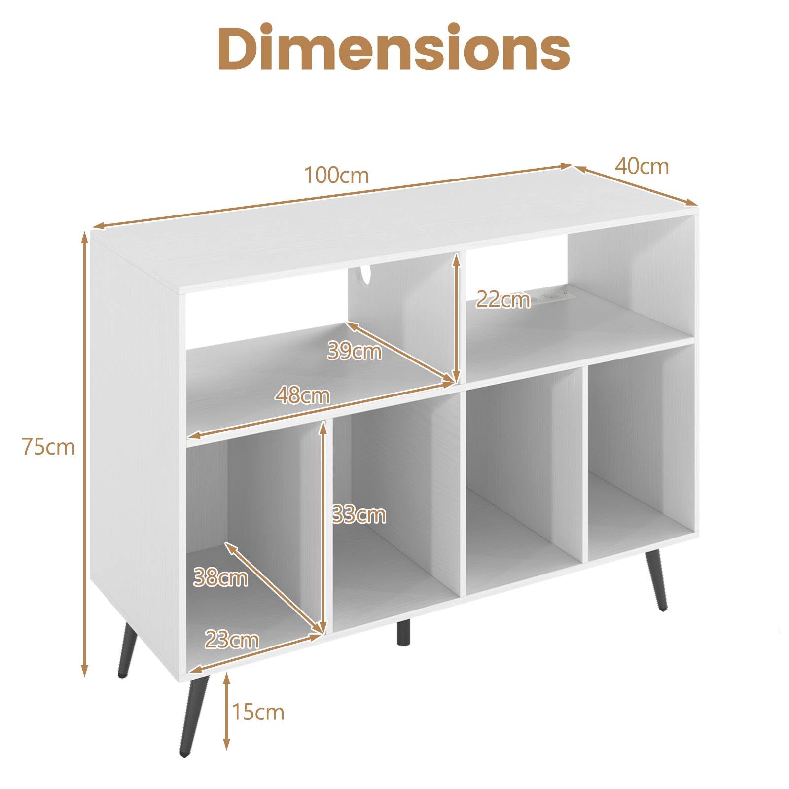 The vinyl display shelf with charging station allows you to charge devices conveniently while enjoying your favorite records. This turntable stand features a wide tabletop to accommodate a variety of record players. Plus, 2 compartments offer extra space for storing audio accessories, magazines, or decorative items. Below, you will find 4 vinyl storage shelves, designed to keep your cherished collection organized and easily accessible. Supported by 5 raised metal legs and 2 anti-toppling kits, this record storage table boasts a sturdy foundation for your audio setup. Crafted to cater to music enthusiasts and vinyl collectors, this record player stand is an elegant addition to any space.