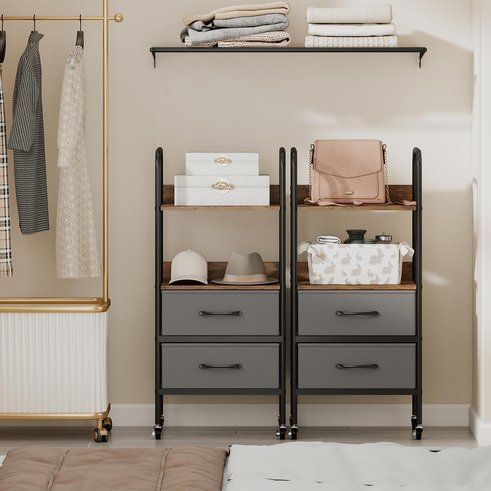 Neat & Enclosed Organization: This rolling cart with drawers includes 2 fabric drawers that offer enclosed storage, helping to keep personal belongings neatly organized and out of sight. Plus, these drawers are foldable for easy assembly.
