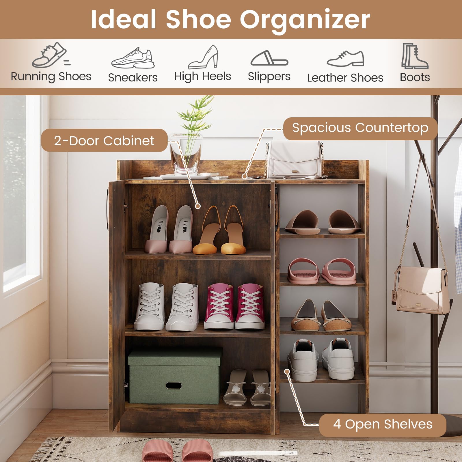 Ample Storage Solution: This shoe cabinet features a 2-door cabinet and 4 open shelves, providing ample space to organize various types of shoes. The spacious countertop is perfect for placing handbags, keys, or decorative items.