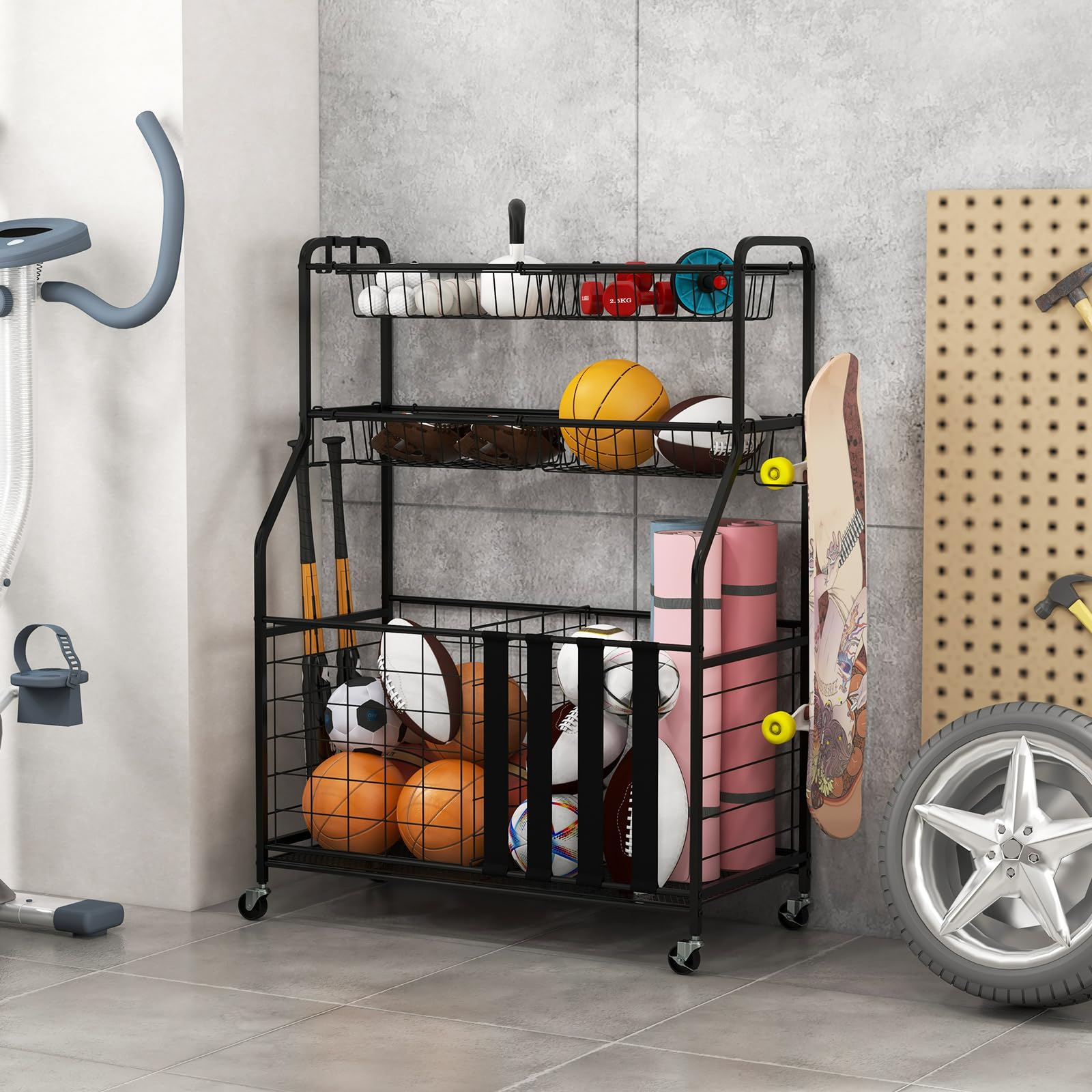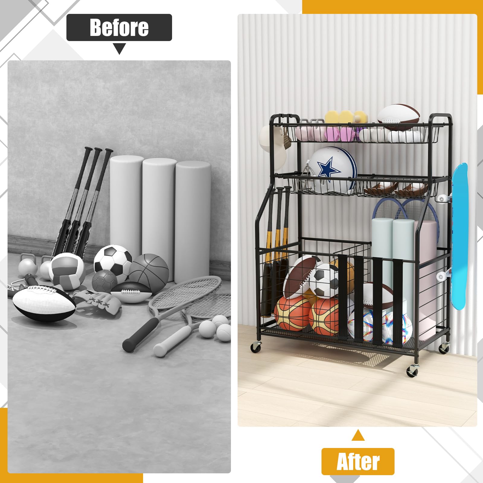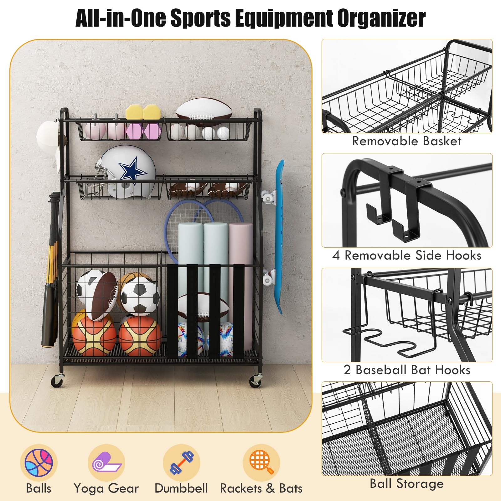 All-in-One Sports Equipment Organizer: Equipped with 4 removable mesh baskets, 2 ball storage, 2 baseball bat racks and 4 removable side hooks, this multi-functional gym rack organizer can store all kinds of fitness equipment in one small place, keeping your workout area clean and organized. Specifically, it can hold jump ropes, yoga gears, exercise mats, dumbbells, rackets and bats and all kinds of balls.