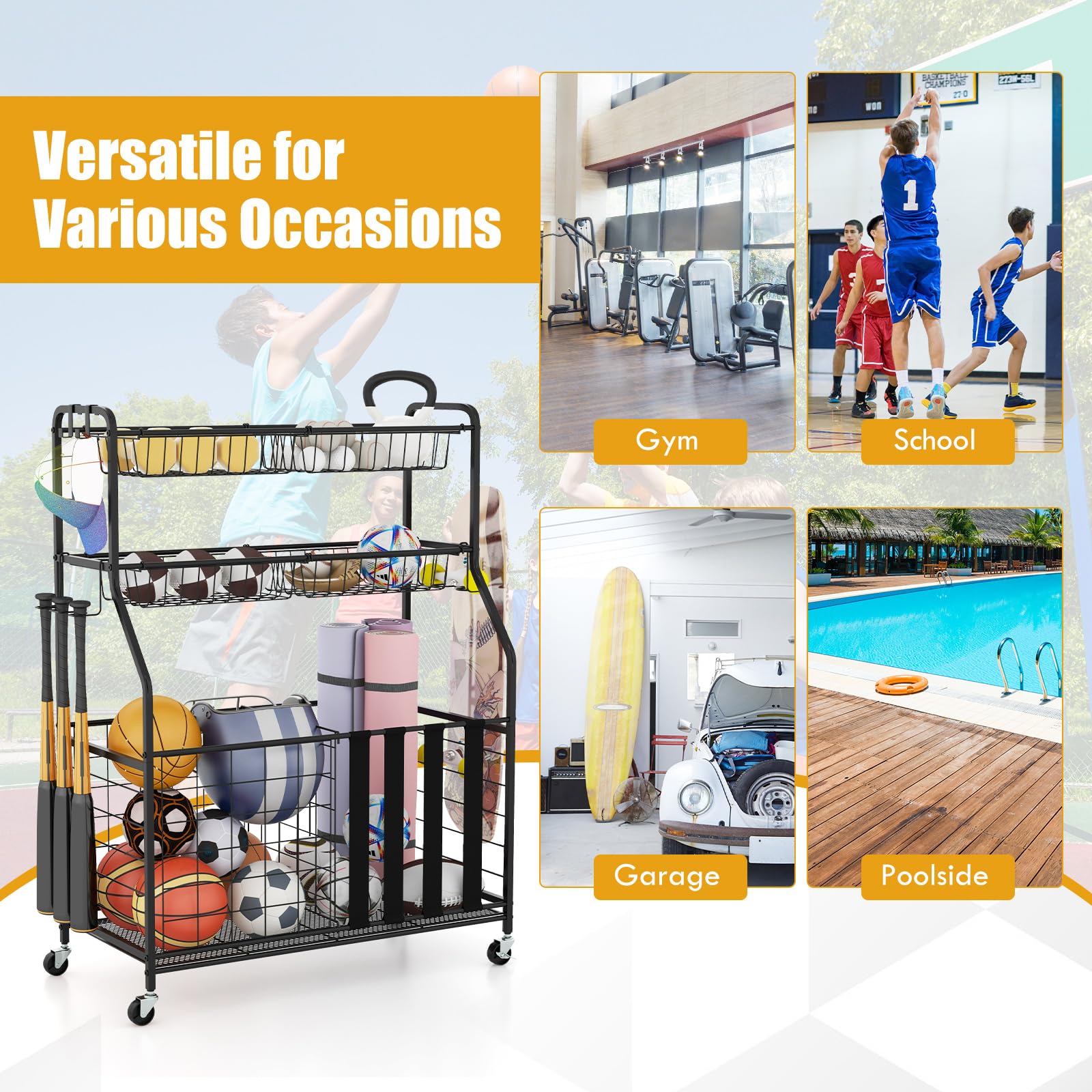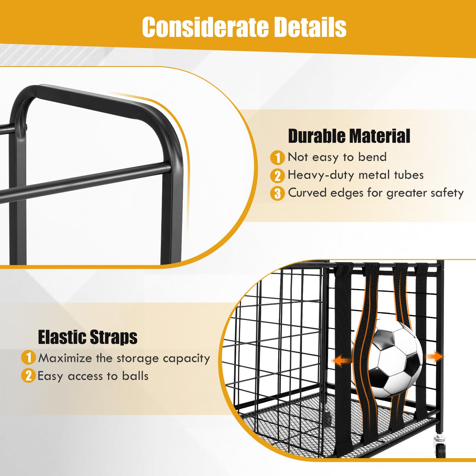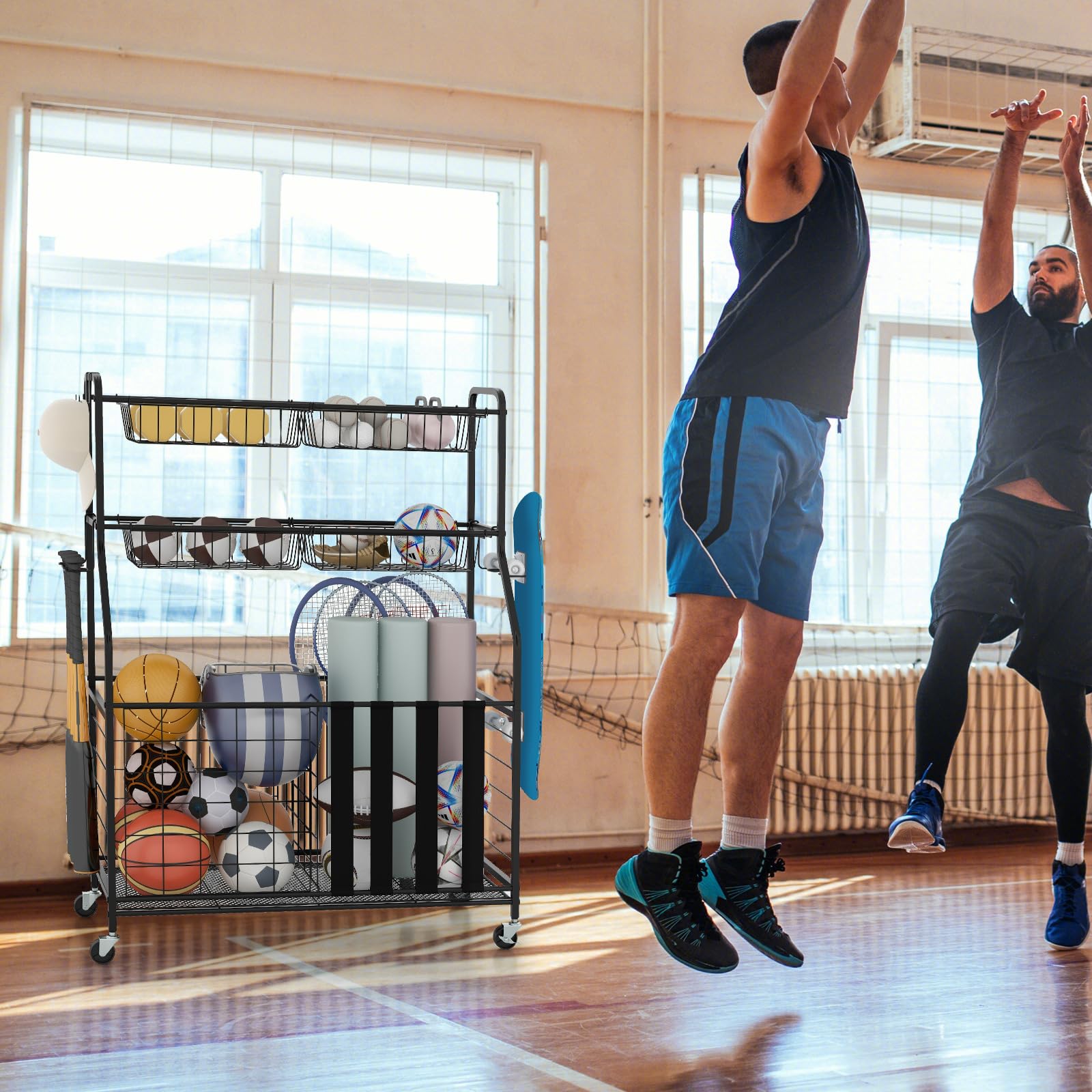 Keep your workout equipment organized and easily accessible with the all-in-one sports gear organizer designed to streamline your fitness routine. This sports organizer is the perfect solution for storing a variety of fitness equipment in one convenient location. With its sturdy and durable construction, including a secure elastic strap design for easy access to balls, this organizer can hold all of your equipment securely. Plus, equipped with smooth-running wheels and locks, you can effortlessly move the rack to different locations. Versatile for gyms, schools, garages and poolside areas, this sports gear organizer optimizes space and simplifies the process of locating and accessing your workout equipment.