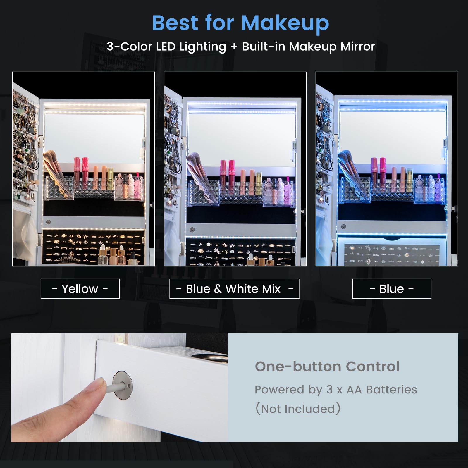 Built-in Mirror and 3-Color LED Lighting: There is a small mirror inside the jewelry organizer cabinet. Along with the 3-color LED lights (yellow, blue, blue and white mix), you can select and try on jewelry conveniently. Please note: the lights are powered by 3 x AA batteries (not included).