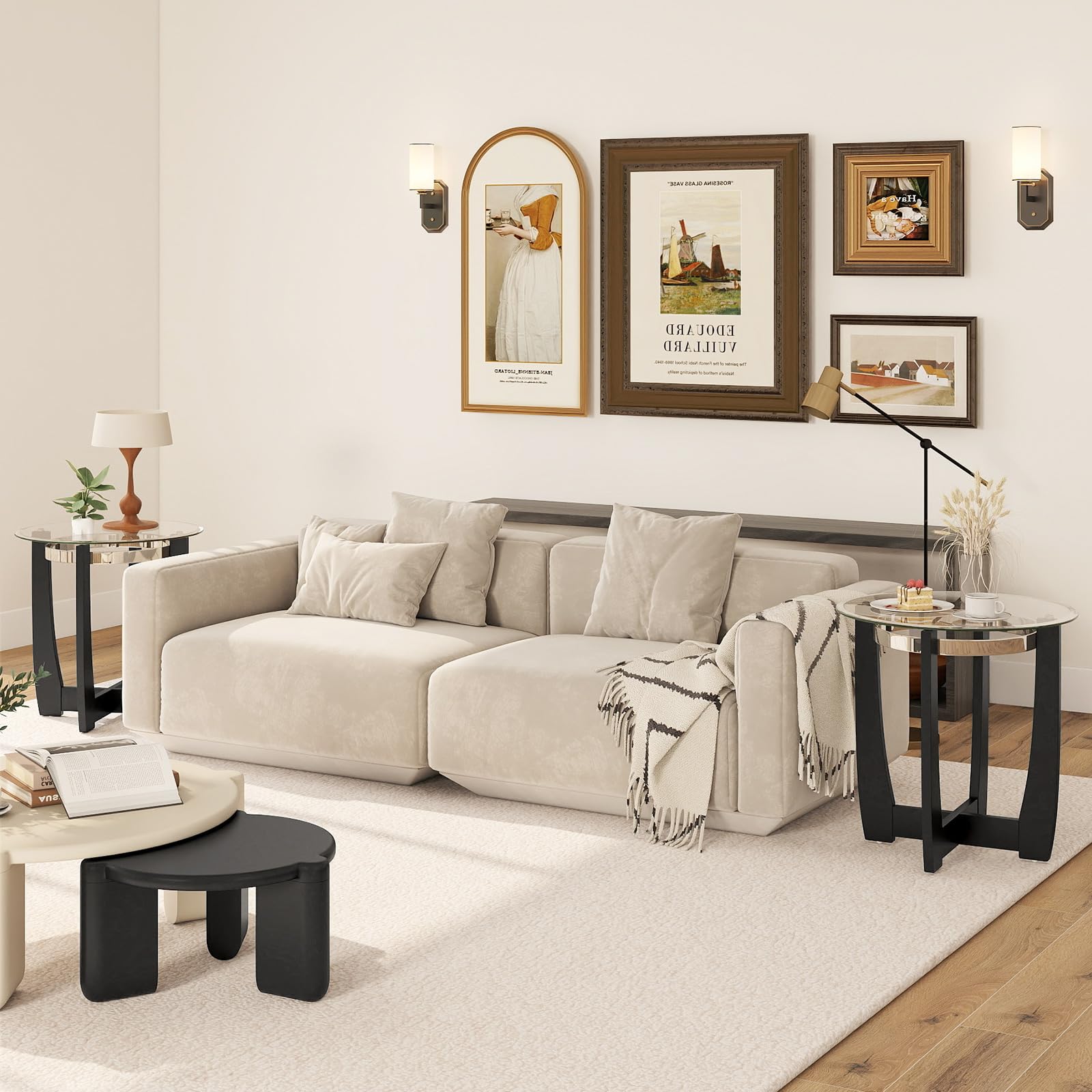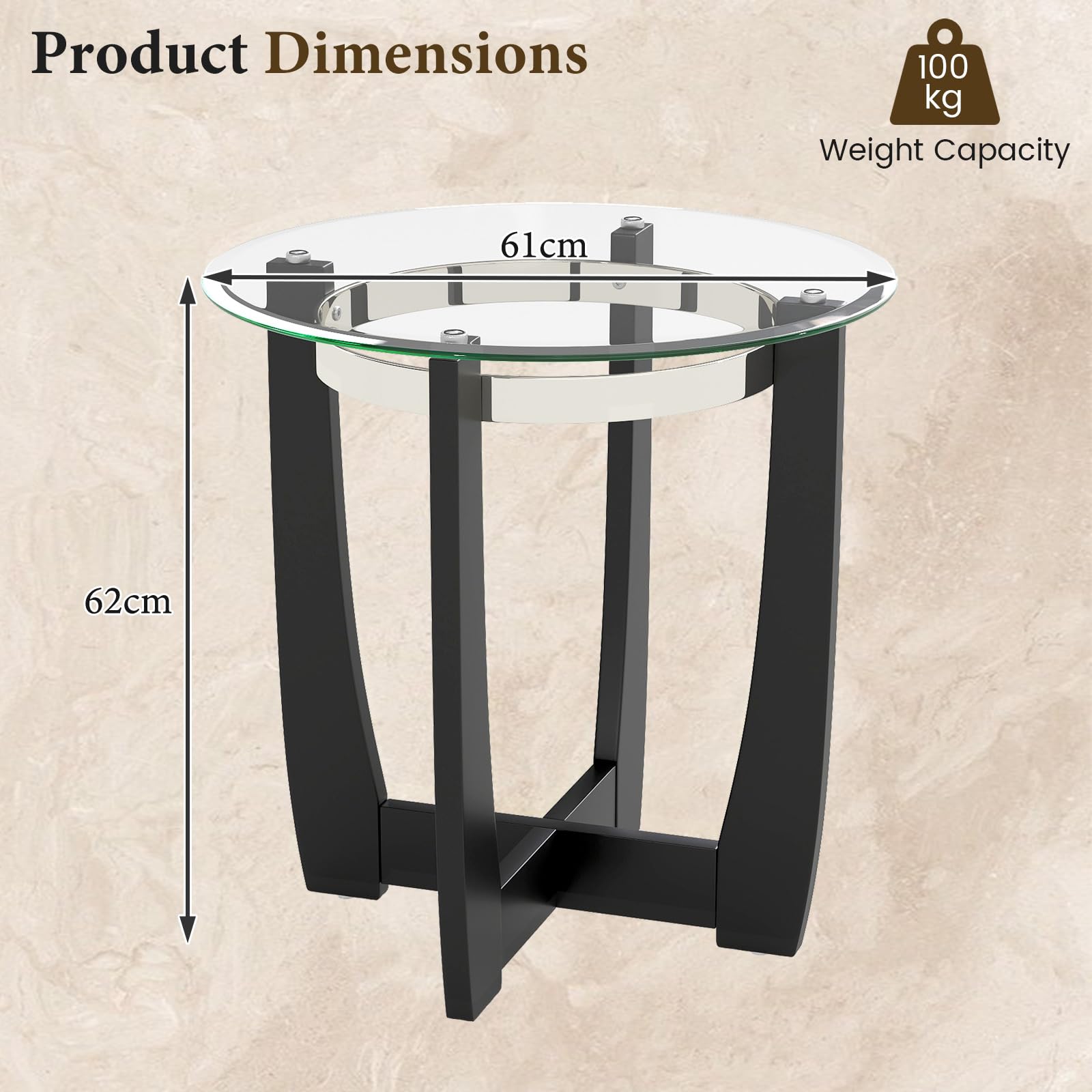 Tempered glass end table, round sofa side table with rubber wood cross base