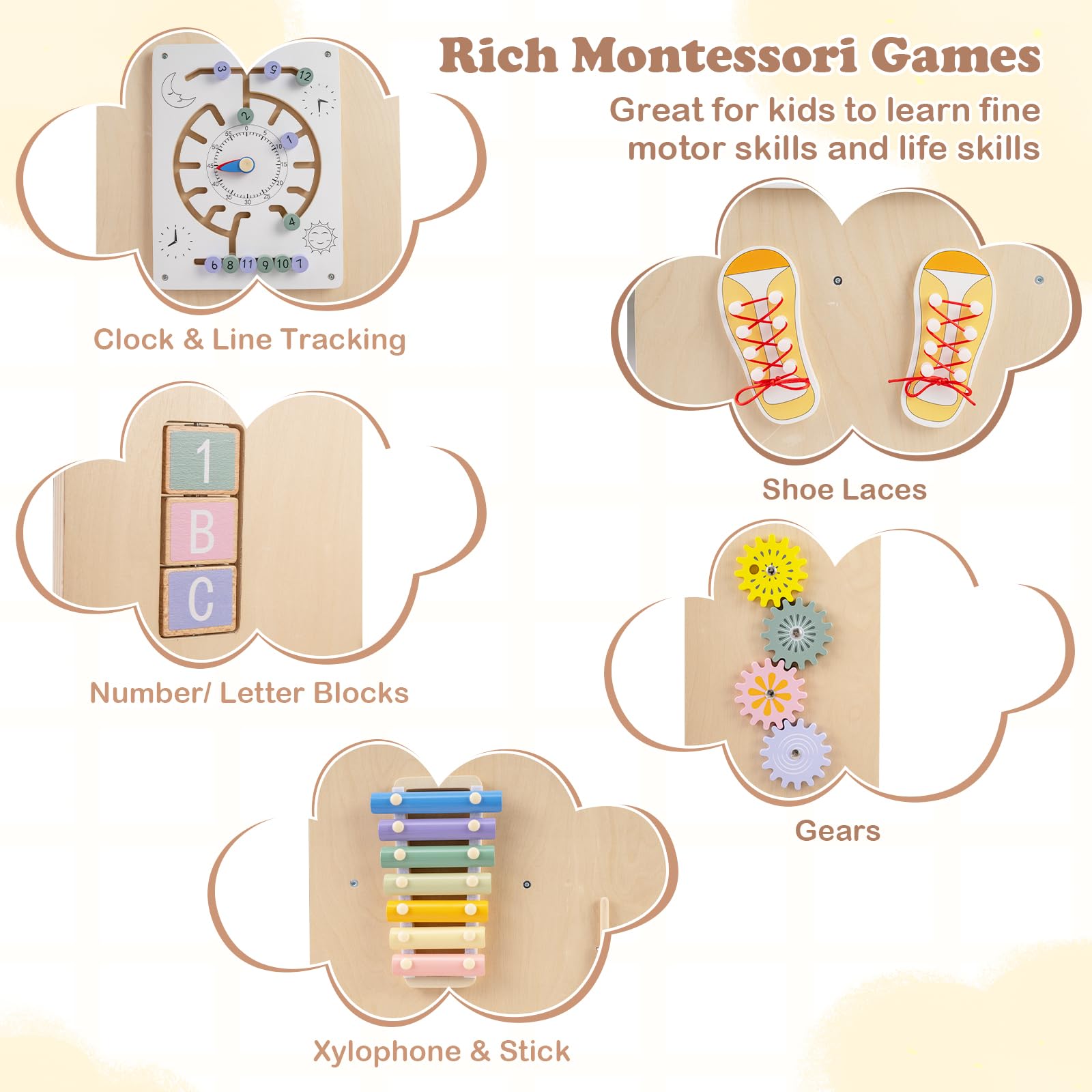 Extra Montessori Games: The kitchen standing tower boosts your child’s learning with the included Montessori games that encourage independent exploration and problem-solving skills. Shoe laces, gears , number/ letter blocks, xylophone & stick, and clock & line tracking are included.