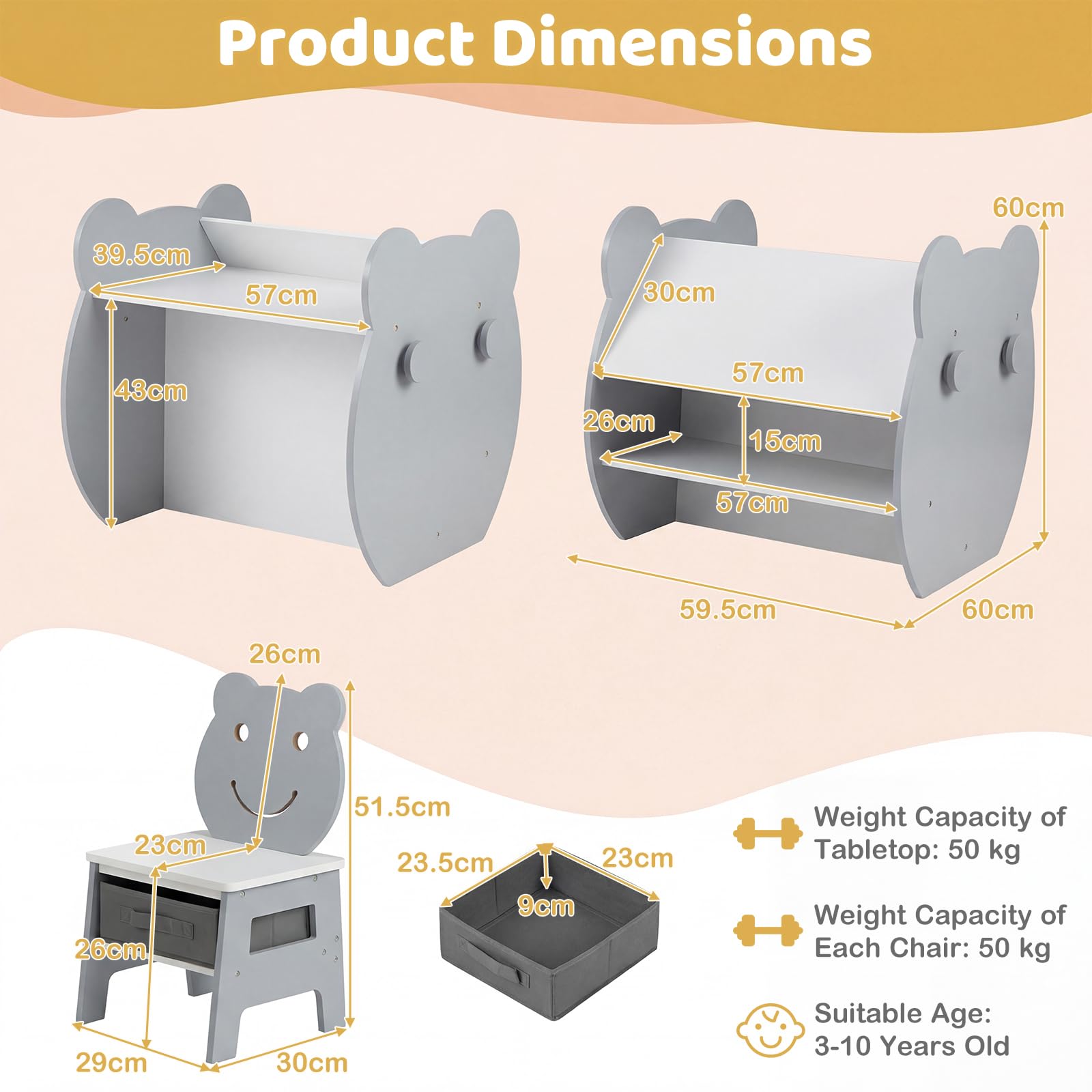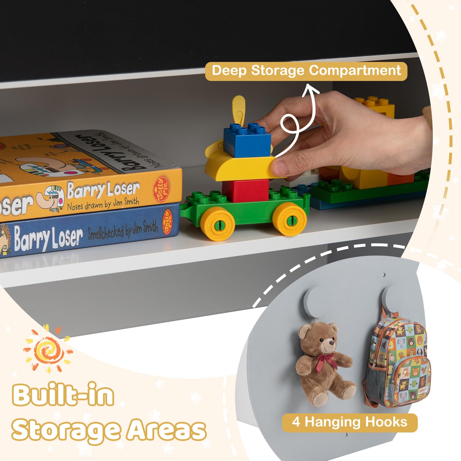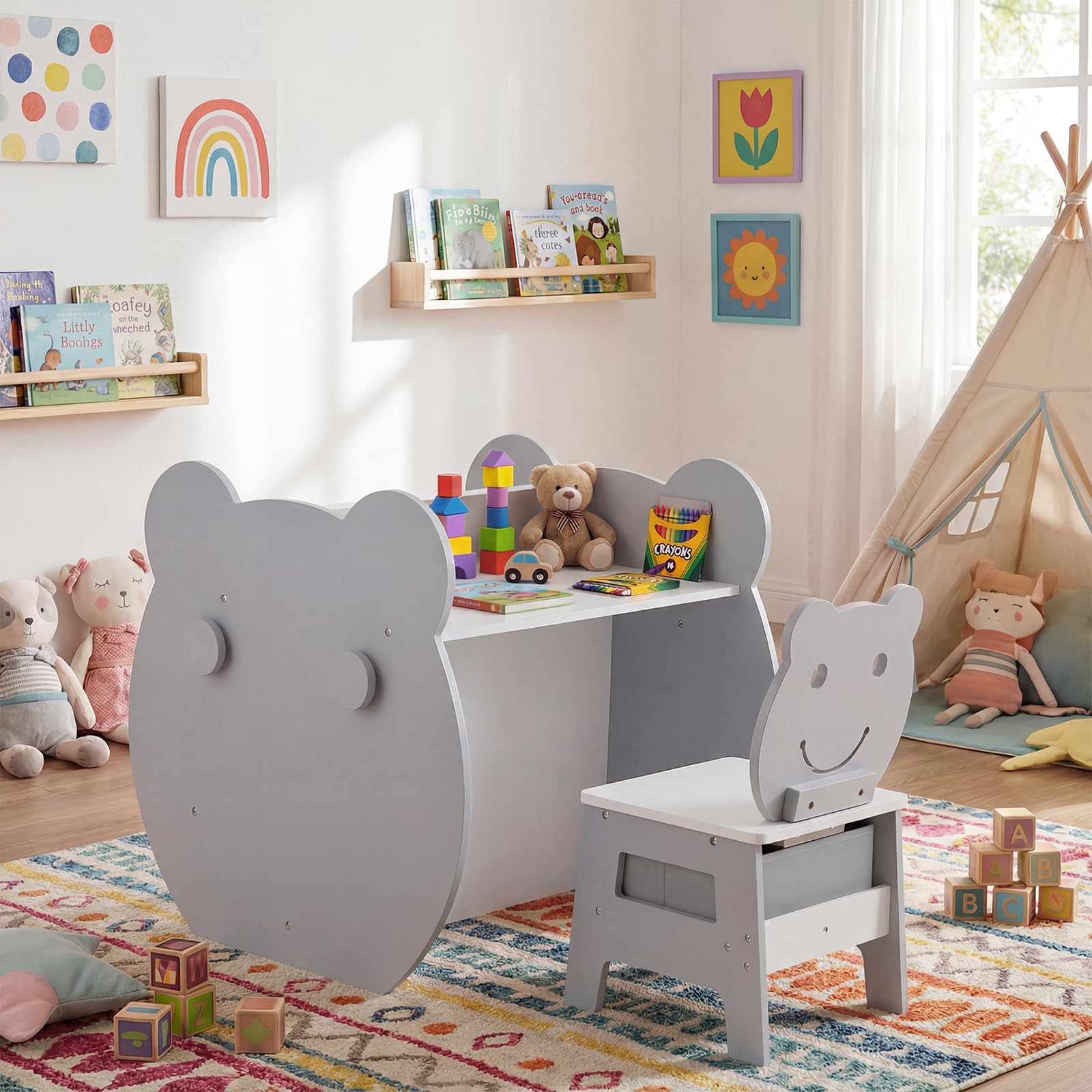 With a cute bear-shaped desk and chair, little artists get a writing surface, a whiteboard, and a chalkboard all in one spot. A roomy storage bin under the seat, deep compartment beneath the table, and 4 handy hooks make it easy for kids to stash supplies, books, and favorite toys. The chair is just the right height with a comfy, supportive backrest for extended painting or reading sessions. More thoughtful features like a sturdy build and rounded corners give everyone peace of mind, so kids ages 3 to 10 can relax and get creative in their own special zone.