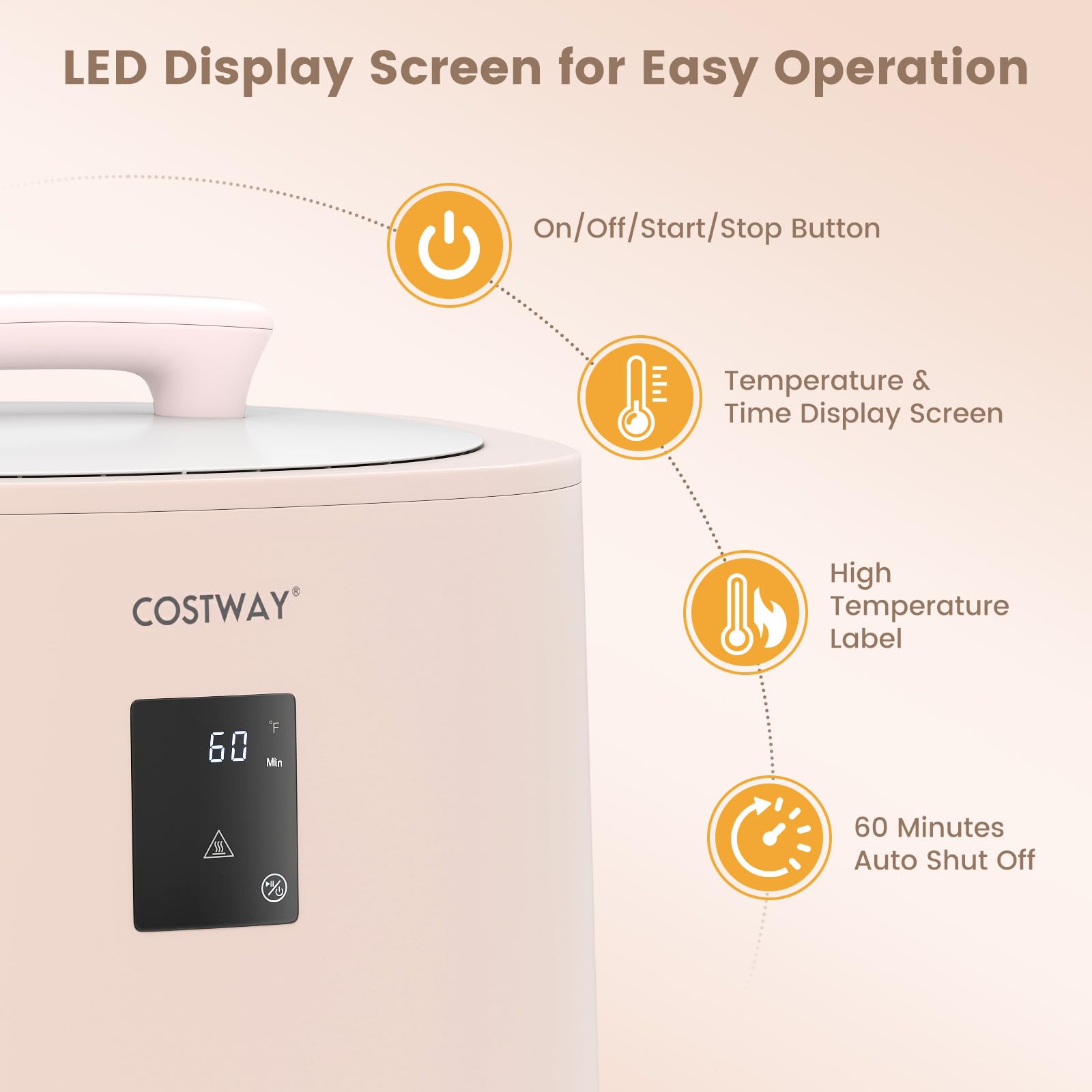 Easy and Safe Operation: The sleek LED display offers clear and intuitive control over the settings, including an on/off/start/stop button, temperature and time. Safety is also a priority with overheat protection. The 60-minute auto shut-off design reduces energy consumption while ensuring reliability.