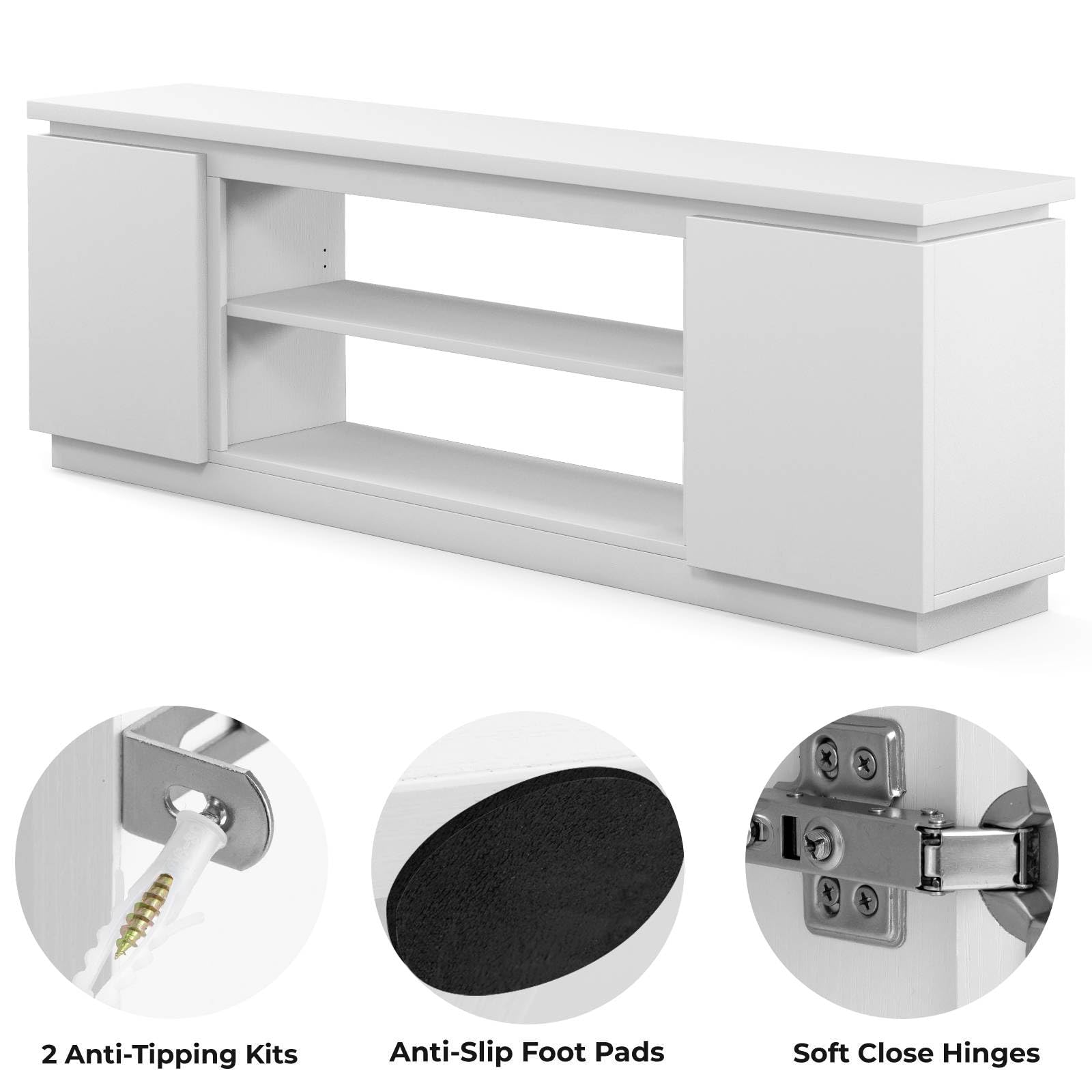 Reliable Construction: Made of selected boards, the wooden TV cabinet supports up to 480 lbs. Moreover, the anti-tipping kits secure the unit safely. The stand also has soft-closing hinges that protect fingers and anti-slip foot pads to protect the floor.