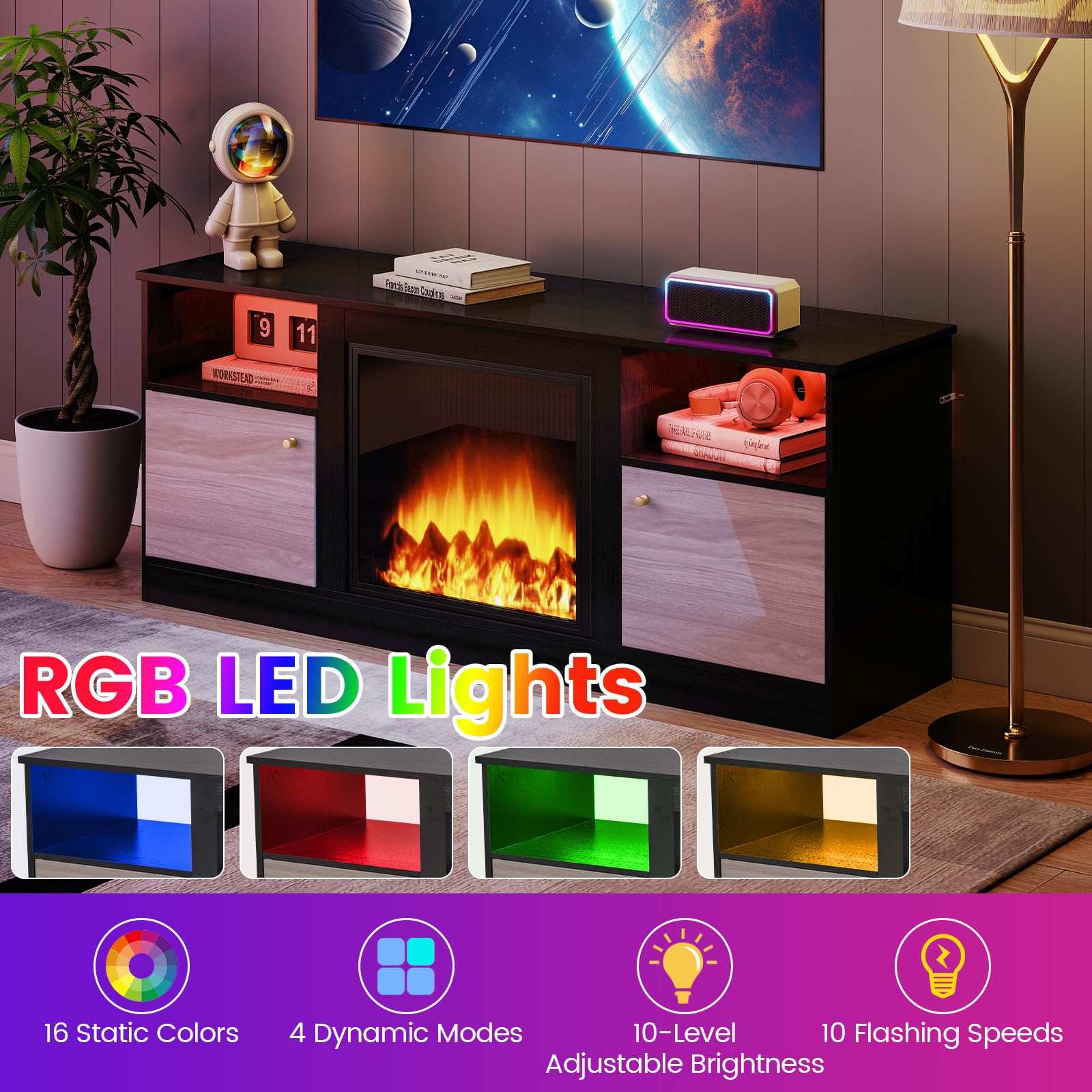 Charming RGB Lighting: This entertainment center comes with a remote-controlled RGB LED strip offering 16 colors, 4 dynamic modes, 10 brightness levels, and 10 flashing speeds to match any movie night or party vibe. Switch from cool blues for gaming to warm reds for romance without ever leaving the couch.