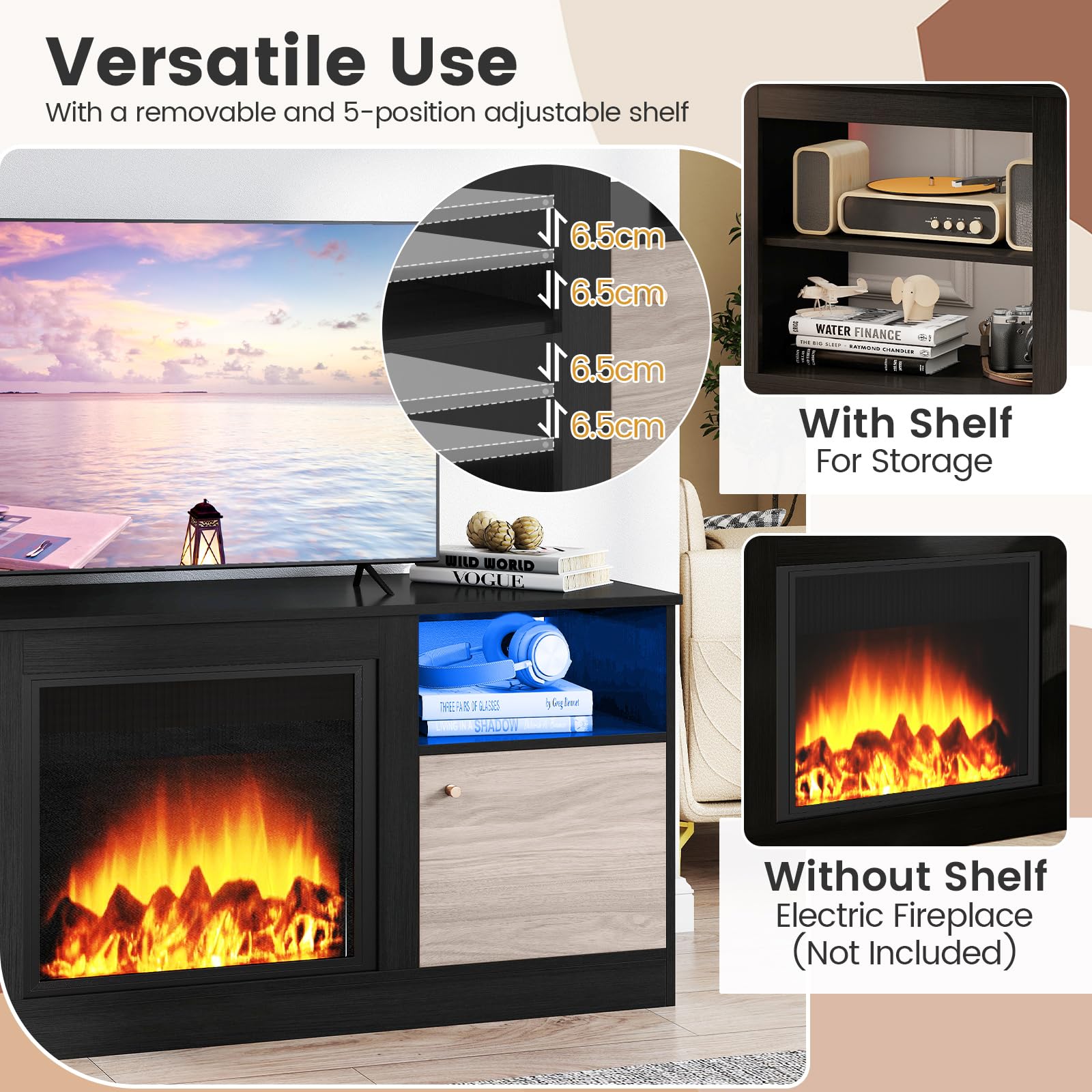 Customizable Fireplace Centerpiece: The open-back middle compartment of this TV stand features a 5-level adjustable shelf that lifts out in seconds, so you can slide in an electric fireplace (not included) for instant warmth and ambiance. Simply plug it in, and your living room becomes a cozy retreat everyone will love.