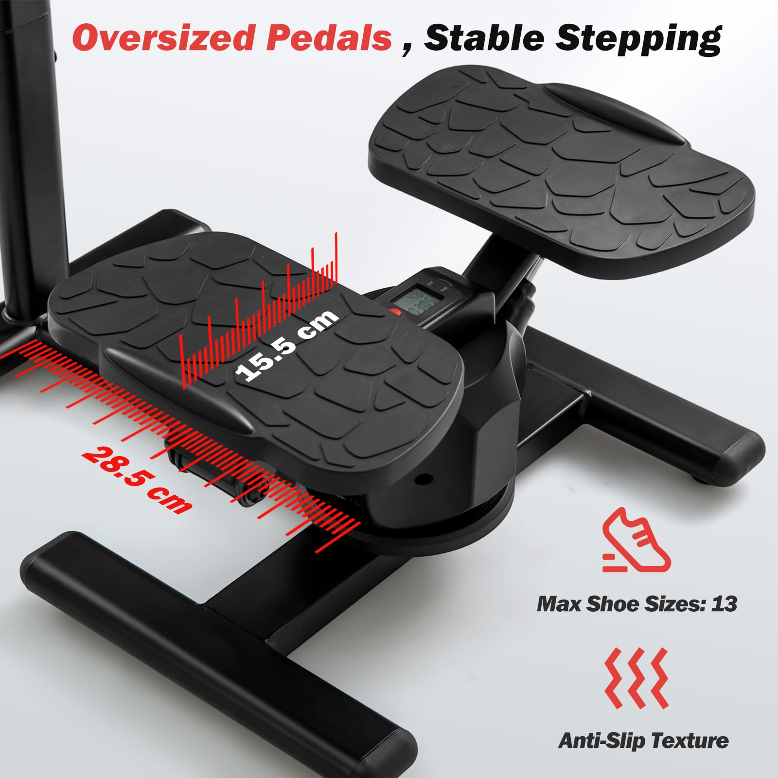This stepper machine engages core muscles and improves coordination with the enhanced range of motion. The adjustable height handlebar ensures comfort for users of various heights. You can keep track of your progress with the built-in LCD monitor. The sturdy metal frame with a wide base, along with anti-slip oversized pedals, ensures stability and safety during use. This step exerciser is perfect for home workouts and apartments, offering a noiseless exercise option.
