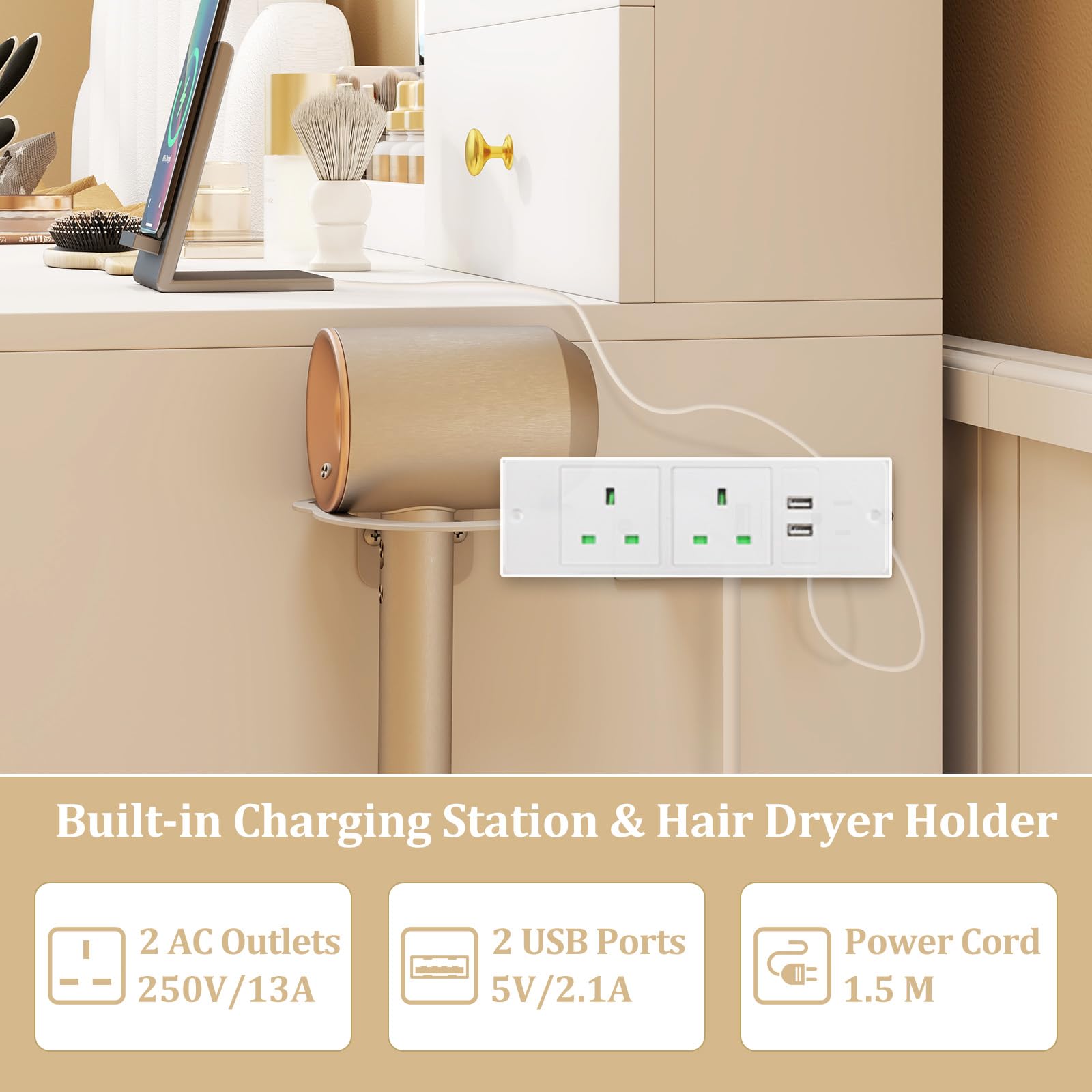 Provides Multiple Storage Options: The vanity set comes with 1 jewelry cabinet, 1 ordinary drawer, 1 open compartment, 1 hair dryer holder, 1 fluted glass cabinet, and 2 fluted glass drawers to arrange your jewelry, cosmetics, and hair dryers. The 3-level adjustable shelf behind the door ensures customized storage space. You can change the active shelf position for items of different heights.