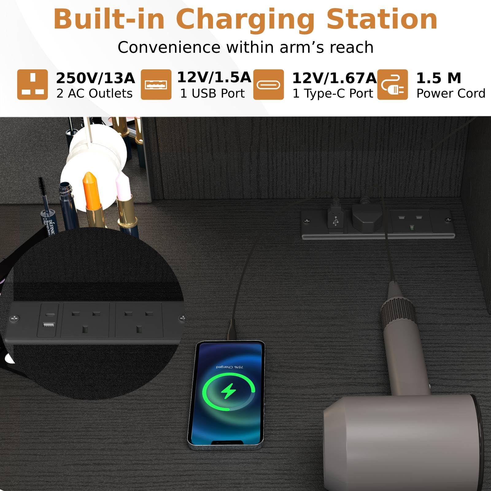 Additional Charging Station: The extra charging station has 2 AC outlets (250V/13A) , a USB(12V/1.5A) and a Type-c ports (12V/1.67A), allowing you to freely charge your phones, beauty tools, or other devices. The power cord is 1.5 m long. Additionally, the cable management hole helps to organize your cables.