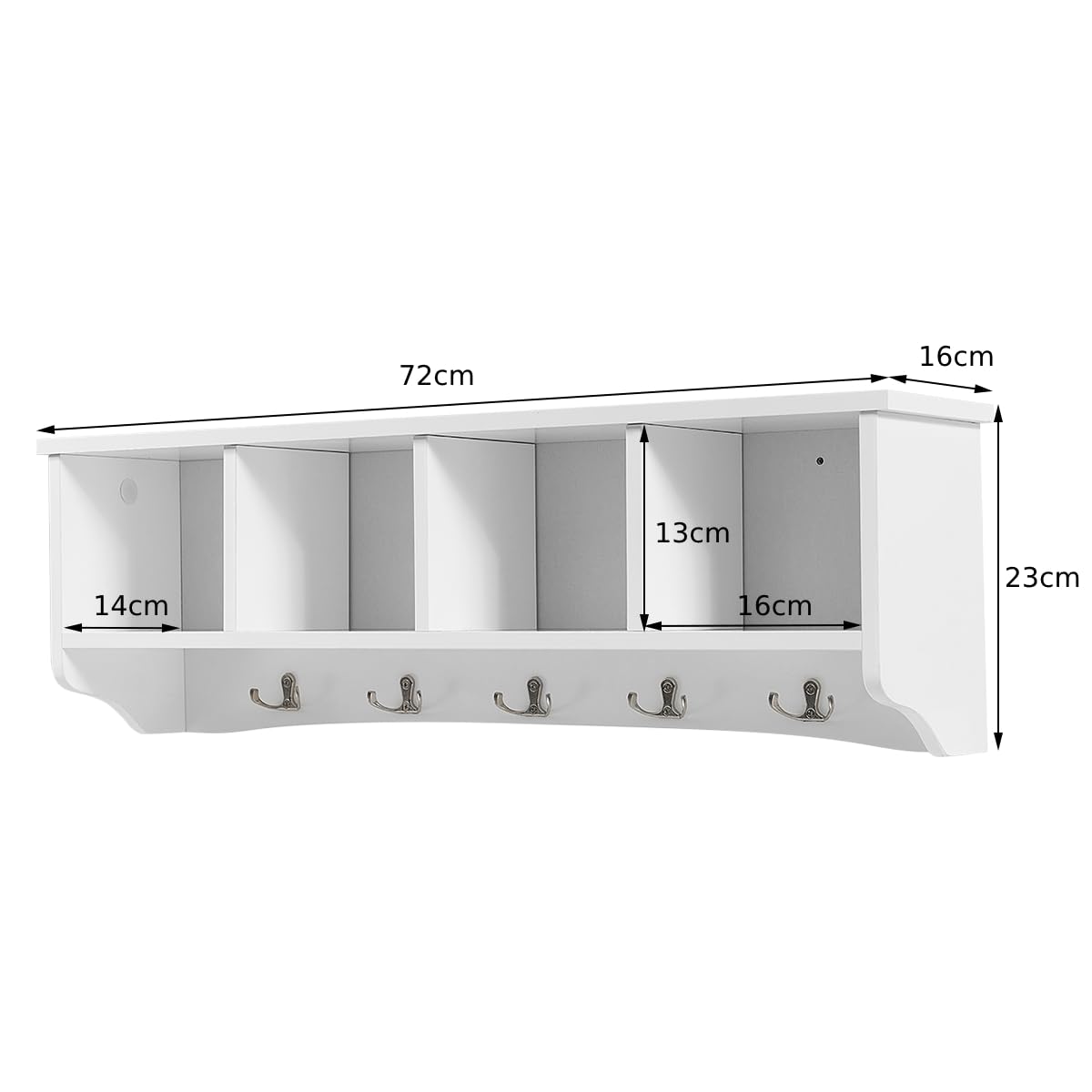 Enough Storage Space: Four compartments offer space for your books, bottles and other accessories. Different kinds of things can be sorted in these four compartments for easy taking. In addition, the storage cabinet is equipped with five hooks for hanging your bags, coats and umbrellas.
