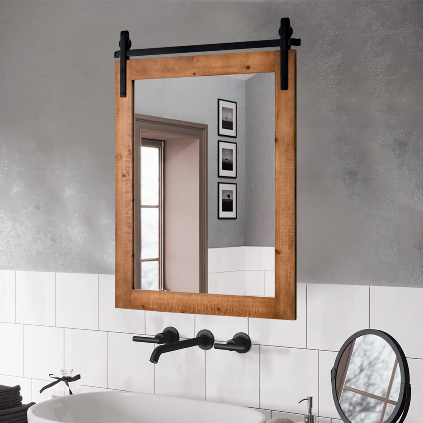 Farmhouse and Rustic Style: Featuring a barn door inspired design and rustic wood grain surface, this wood framed wall mirror is a great combination of farmhouse style and vintage charm. In addition, the black metal bracket on the top adds speciality and a sense of chic to the mirror.