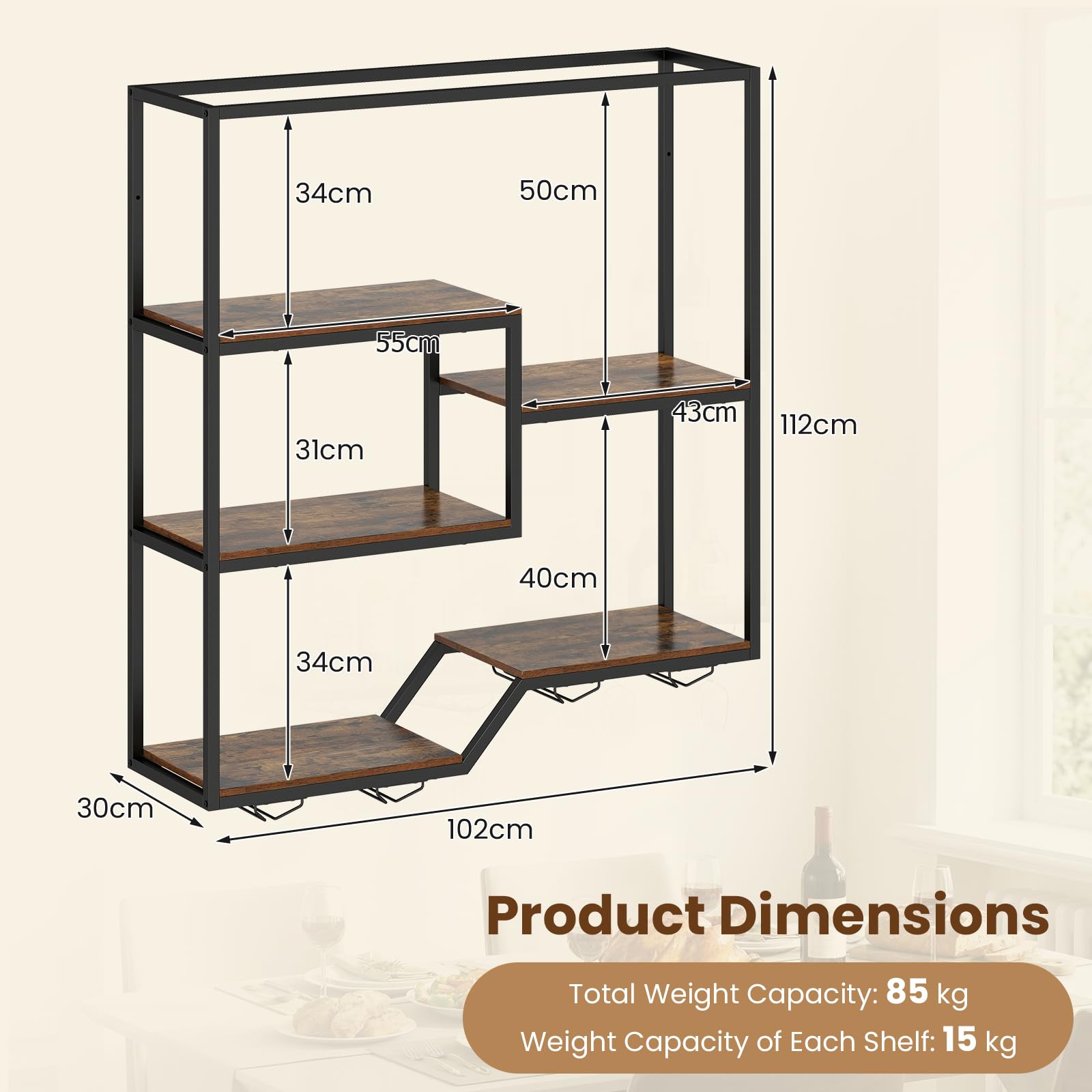 Featuring a smart combination of shelving and glass racks, this hanging liquor rack allows you to conveniently store both your favorite bottles and glasses together, all while freeing up valuable countertop space. Constructed with a sturdy metal frame, the wine bottle storage rack promises stability and long-lasting durability, making it an ideal choice for your kitchen or home bar. Moreover, its industrial finish not only adds a touch of vintage charm but also ensures easy maintenance, perfectly suited for everyday use. Thanks to its adaptable design, this wall wine rack effortlessly elevates storage capabilities and enhances the overall ambiance of your room.