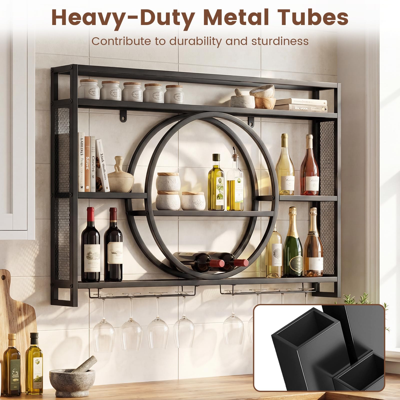 Unlock the art of elegant organization with our wall-mounted wine rack! Built to last, this modern liquor wall shelf is constructed from sturdy metal pipes finished with a premium coating. It can be securely mounted to the wall with pre-drilled holes, effectively freeing up valuable countertop or floor space. Moreover, the staggered shelves store up to 24 wine bottles, and built-in glass holders hold up to 5kg. With protective rails on the top and sides, the liquor bottle display shelf prevents accidental falls and enhances overall safety. Thanks to its contemporary outlook, this wall shelf for wine blends effortlessly into a variety of environments, whether in a home bar, dining room, or restaurant.