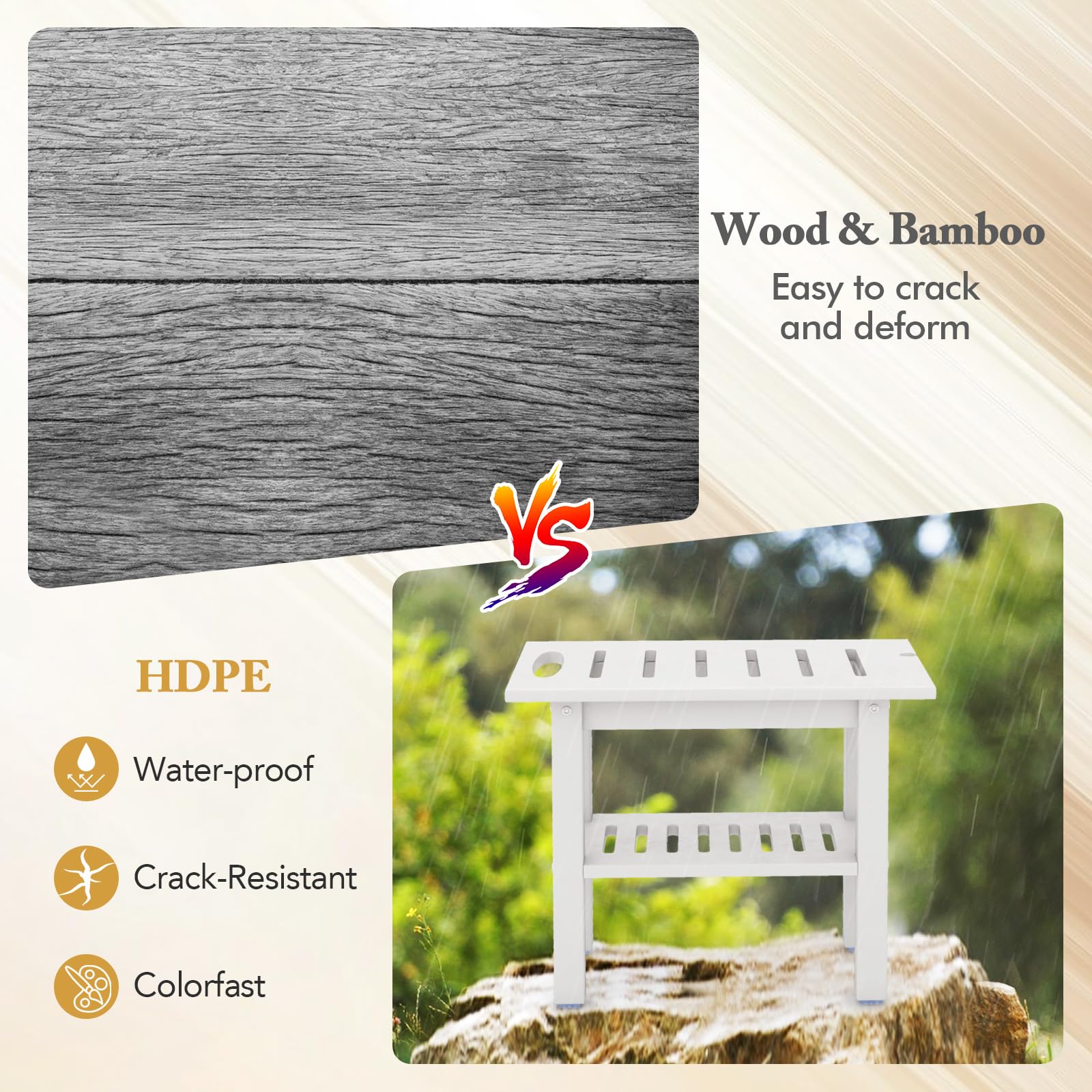 Quality HDPE Material: Unlike wood or bamboo shower stools that are easy to crack and deform, this HDPE shower bench is waterproof and hard-wearing for use inside bath tubs or showers. It remains vibrant after extended use, and is super easy to clean with just a quick wipe.