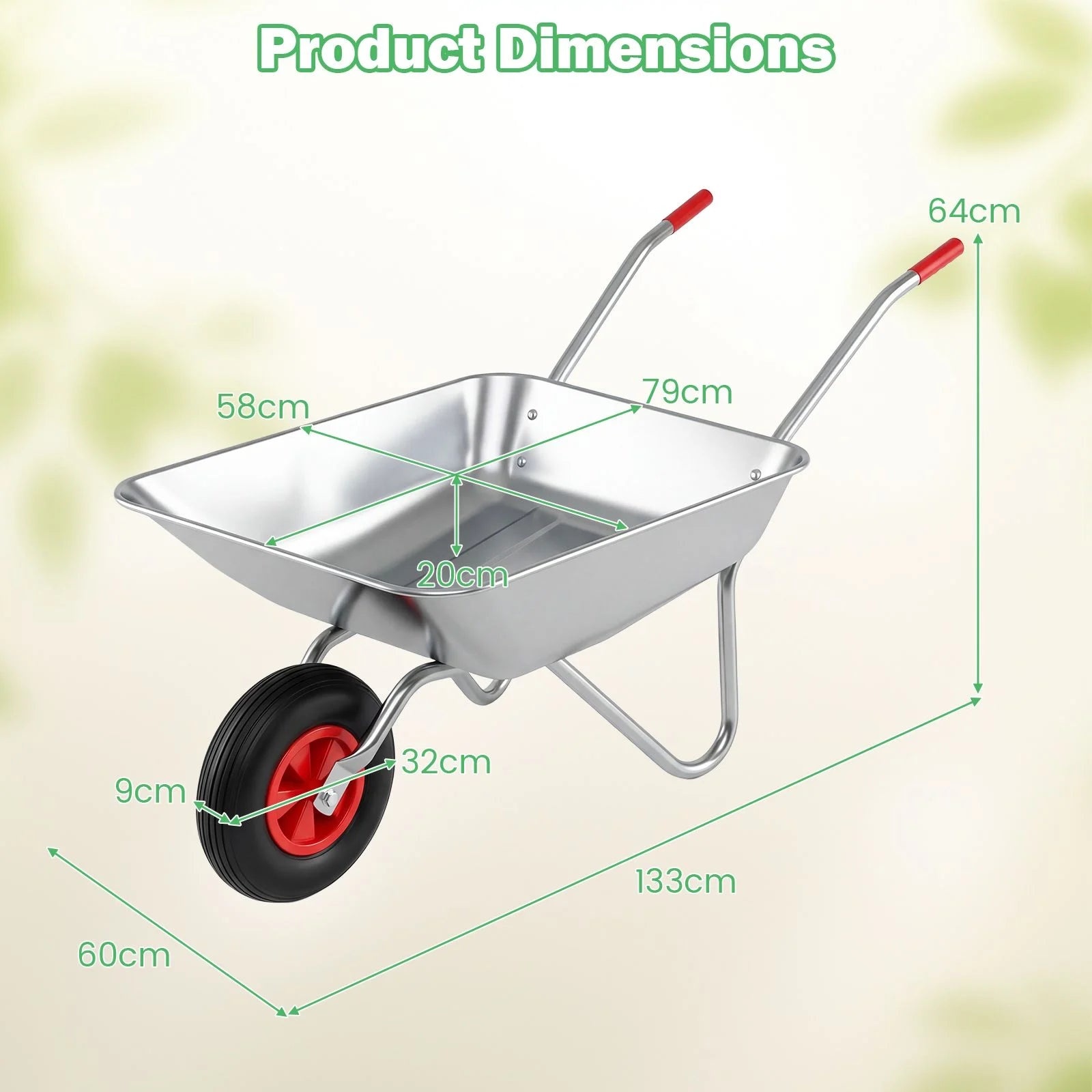 With a robust galvanized metal frame, this garden utility cart features deformation resistance while supporting up to 100 kg. The spacious 62.5 L tray easily transports soil, plants, and tools, cutting down trips. Its large 32 cm rubber tire fits different terrains and makes moving heavy loads easier and more reliable. With 2 easy-to-grip handles for effortless dumping, this cart offers both comfort and strength for farm, garden, or yard chores. Practical and versatile, this utility cart with well-made details will be the smart choice to streamline all your outdoor hauling needs.