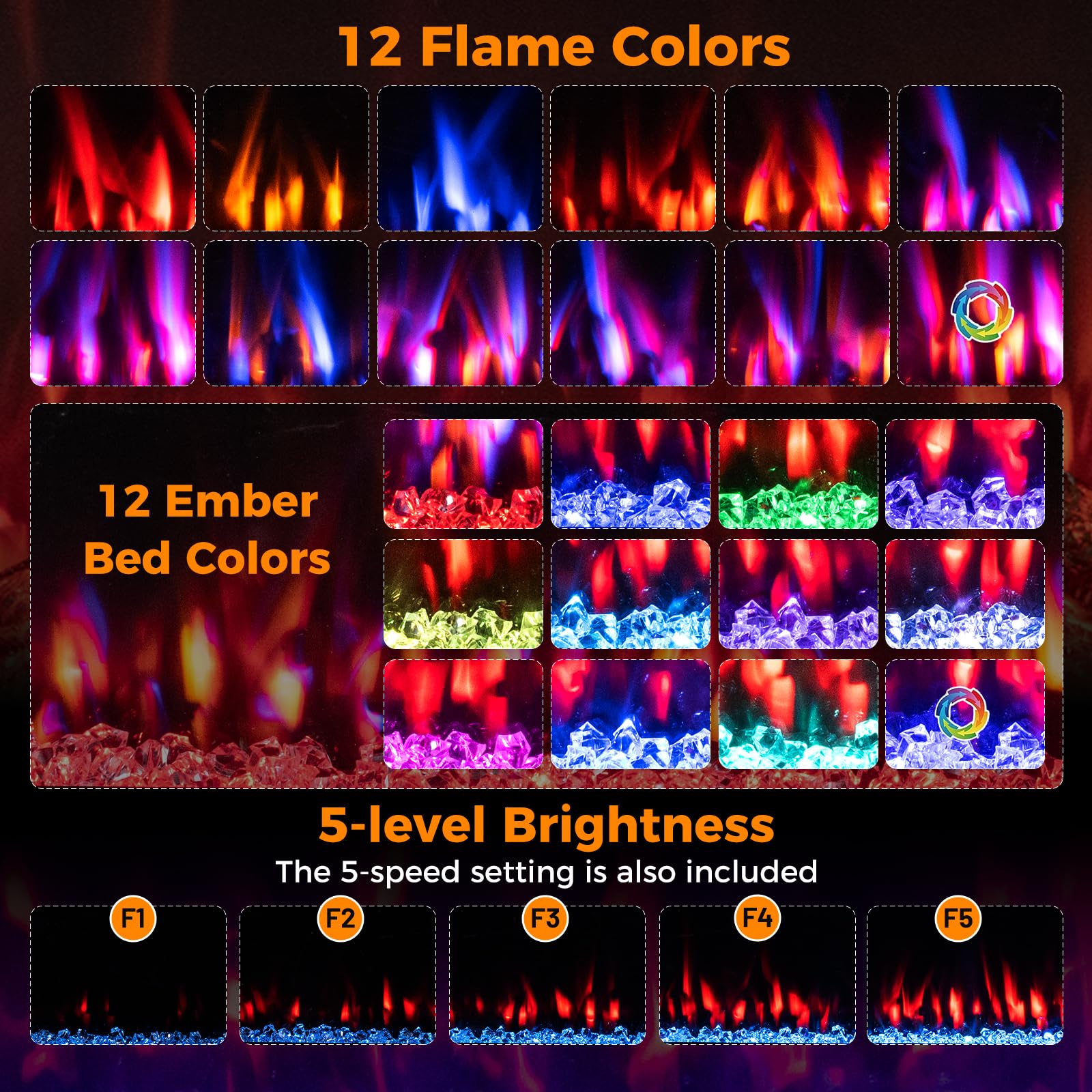 Customizable Flame Effects: The fireplace insert electric offers 12 vivid flame colors and 12 ember bed colors, along with 5 brightness levels and 5-speed flame settings. These flame and ember bed options can be enjoyed independently of the heat function, making it perfect as a decorative feature year-round.