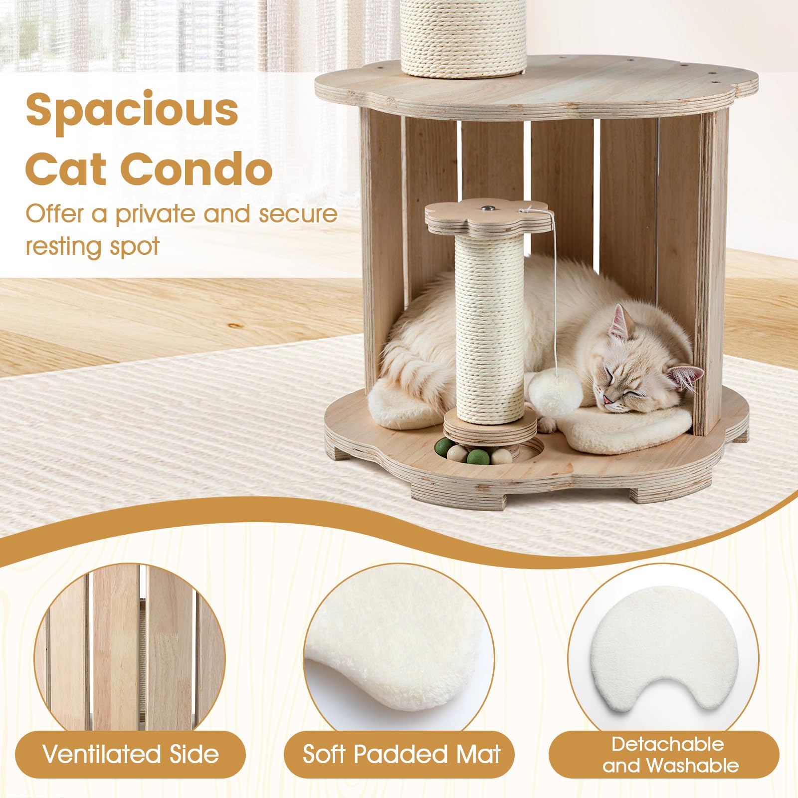 Comfortable Lying Experience: The wooden condo features a ventilated side, paired with a soft padded mat that is detachable and washable, ensuring a comfortable and clean environment for your pets. With its simple structure, the cat tree is easy to set up.