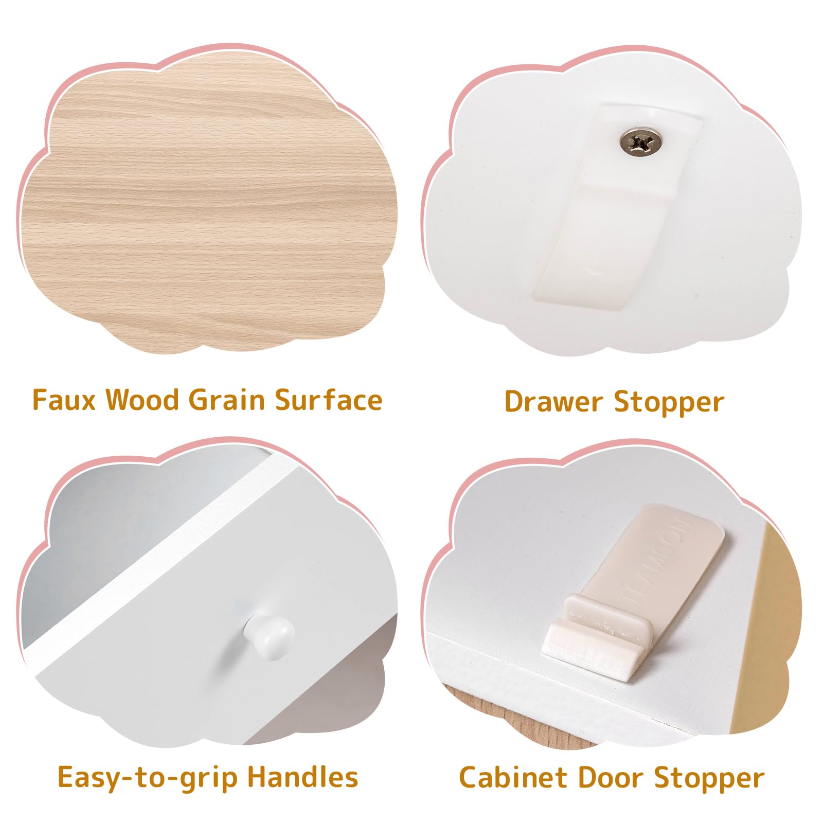 • Two Sliding Doors: The upper cabinet has two sliding doors. One of the doors can be used as a cork bulletin board to pin some notes or notwork, while the other transparent door lets kids view contents without opening.