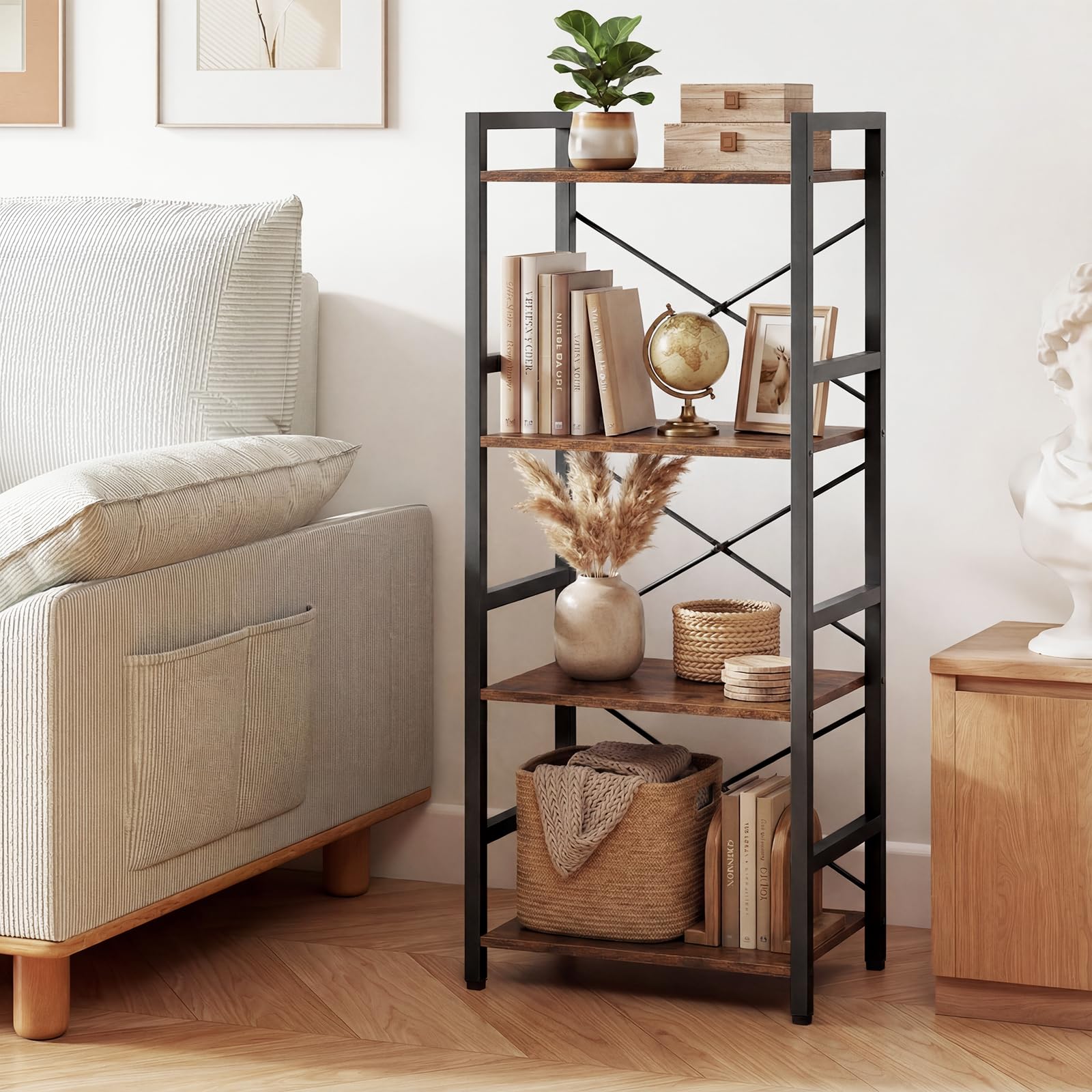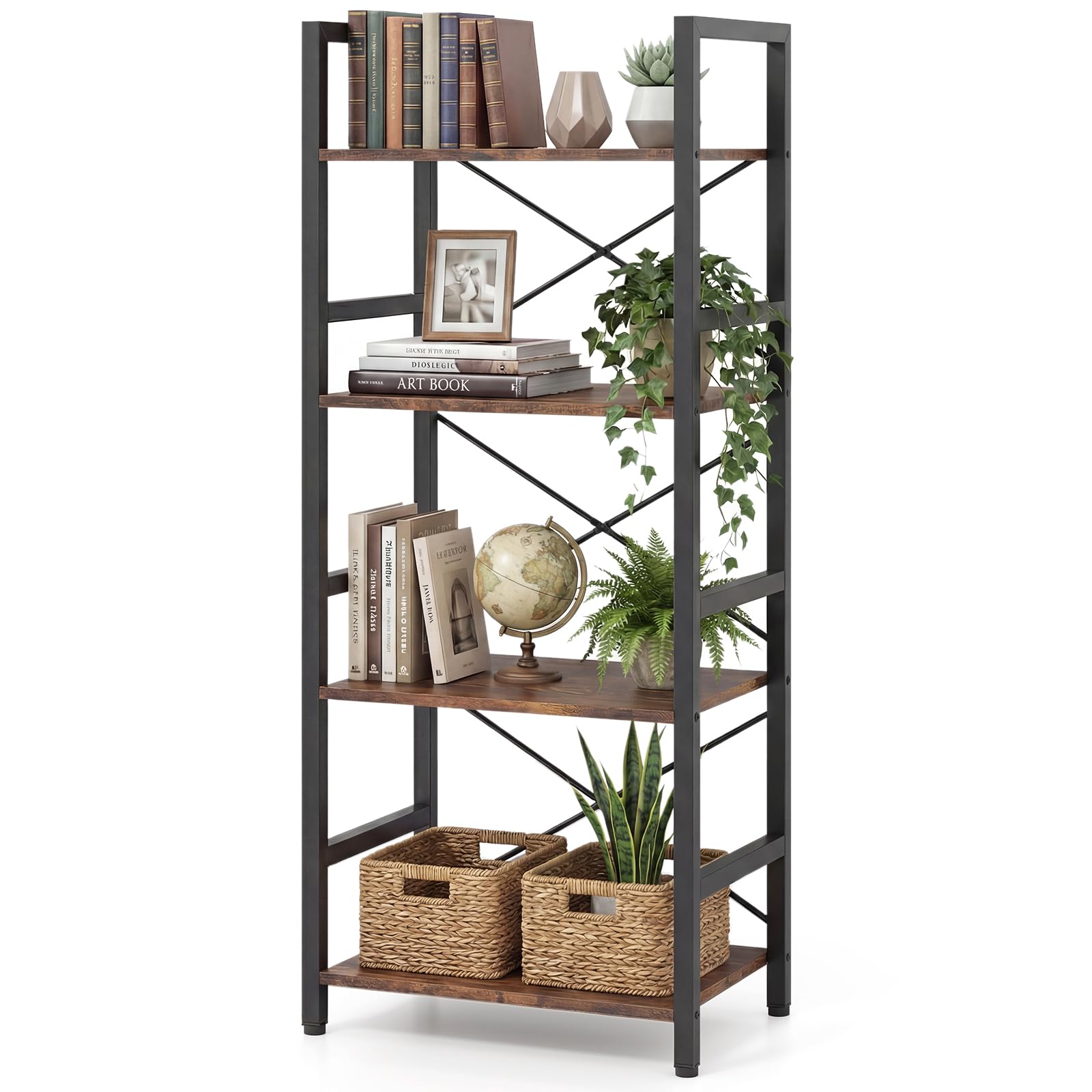 Upgrade your space with this stylish 4-tier metal bookshelf, where industrial charm meets smart storage! Reinforced with a robust X-brace frame and anti-slip foot pads, it boasts rock-solid stability on any surface. The open shelves offer plenty of room to organize books, show off plants, or highlight your favorite collections, all while taking up minimal floor space at just 41 x 27 x 100 cm. Thoughtful features like anti-fall side rails and built-in anti-tip kits keep your items safe and secure. With a rustic wood grain touch and easy-to-clean finish, this versatile display rack is an ideal addition to apartments, offices, and cozy nooks. Make your room look chic and clutter-free! Add it to your cart now and transform your storage today!