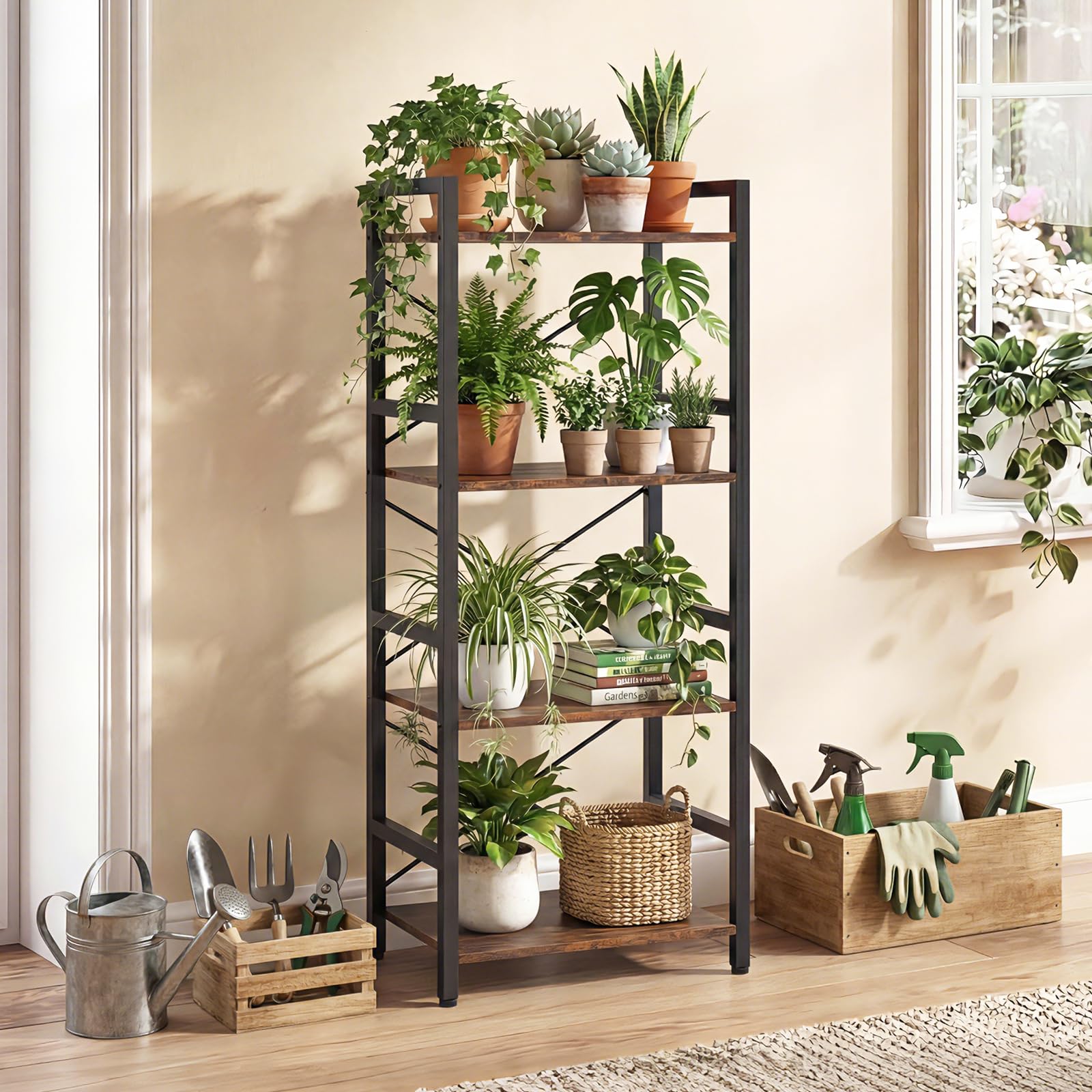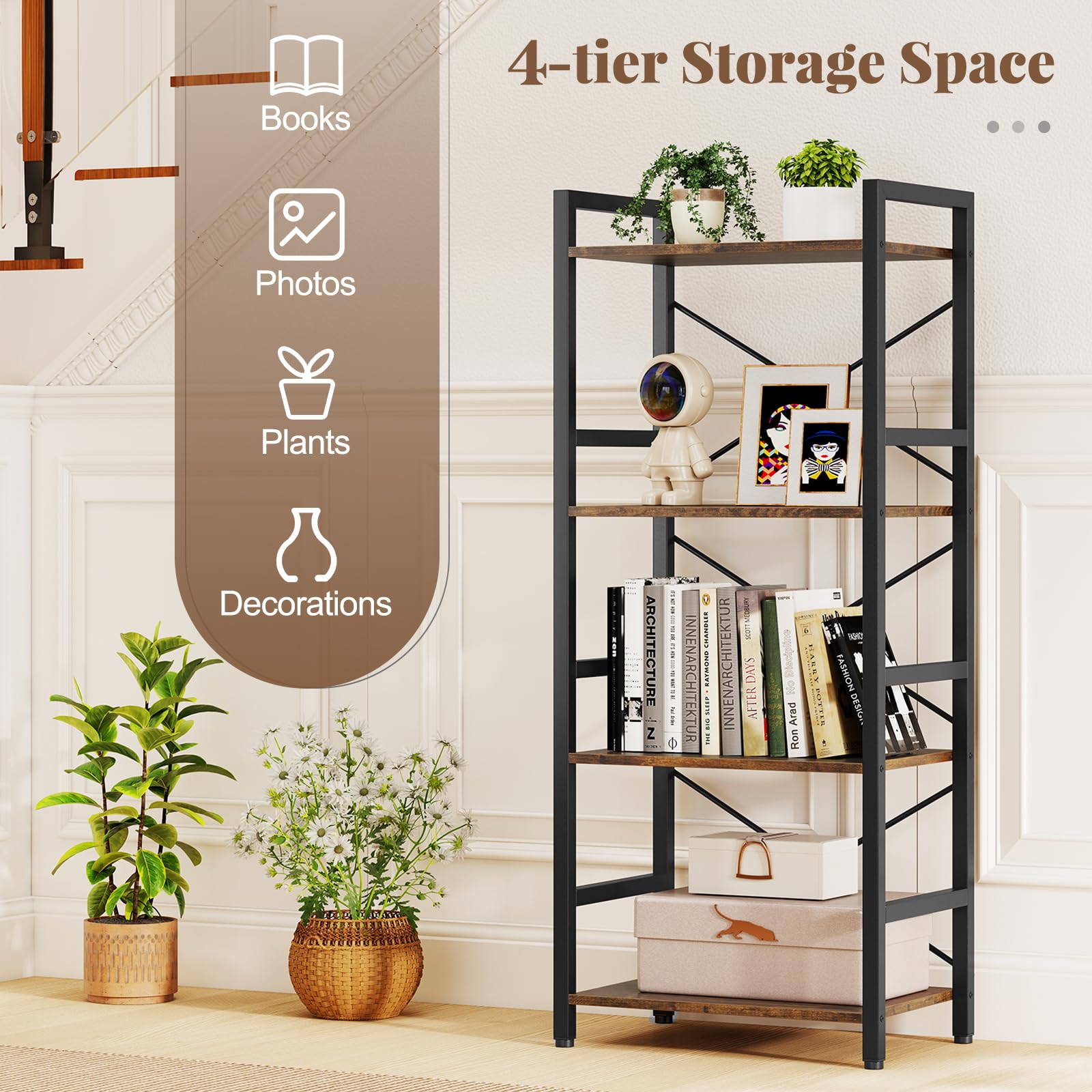 - 4-tier storage space for books, photos, plants, and decorations
